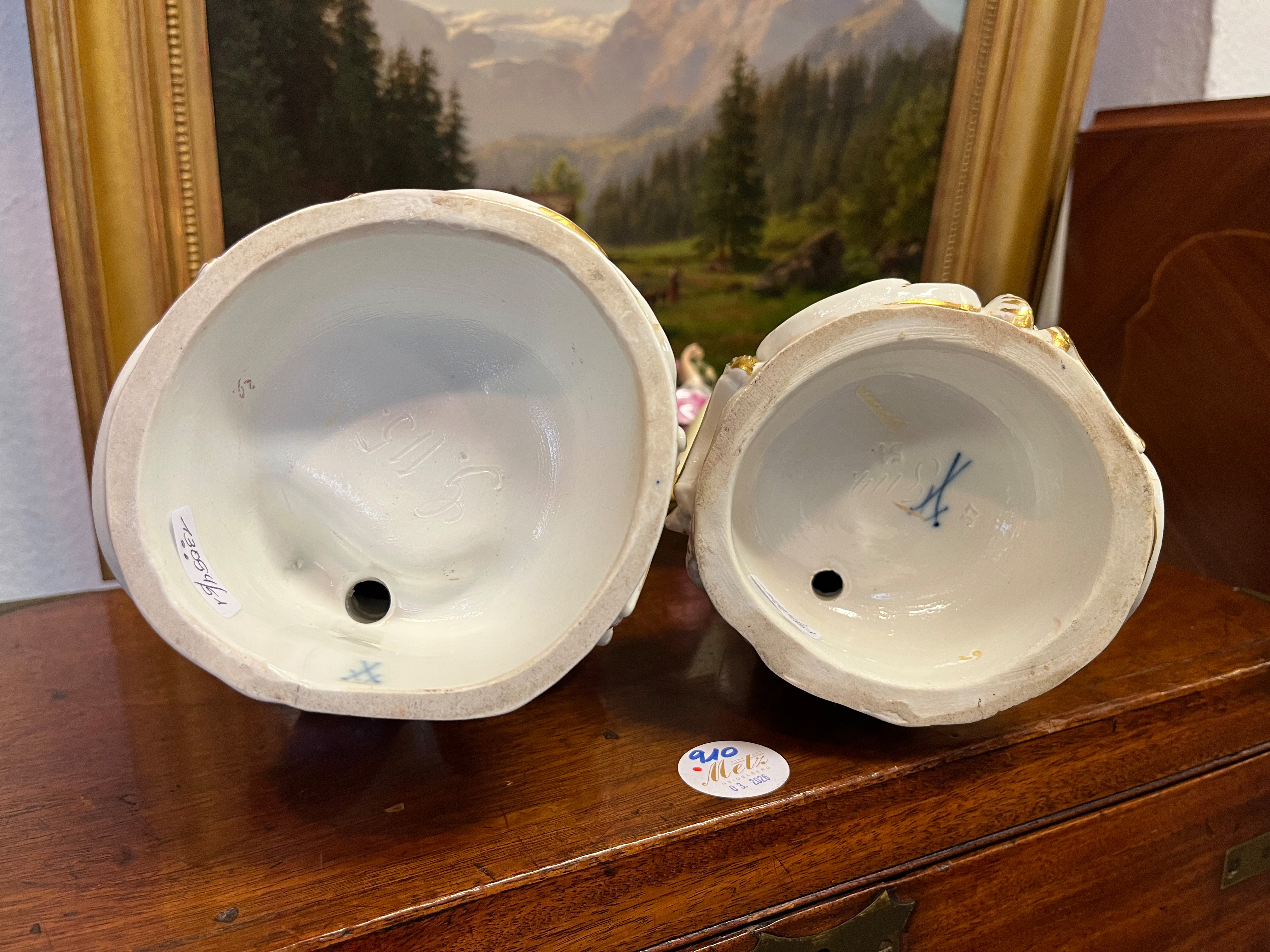 - Katalog-Nr: 1231Paar Gewürzkörbe mit zweiflammigen Girandolenaufsätzen. Meissen 19. Jh. Porzellan, bunt bemalt mit Floraldekor, Goldränder, aufbossierter Blüten- und Blätterdekor; am Boden unterglasurblaue Schwertermarke, Modelle nach Johann Joachim Kaendler, H=25 cm. (min. best. / min. rest.).o.L.
