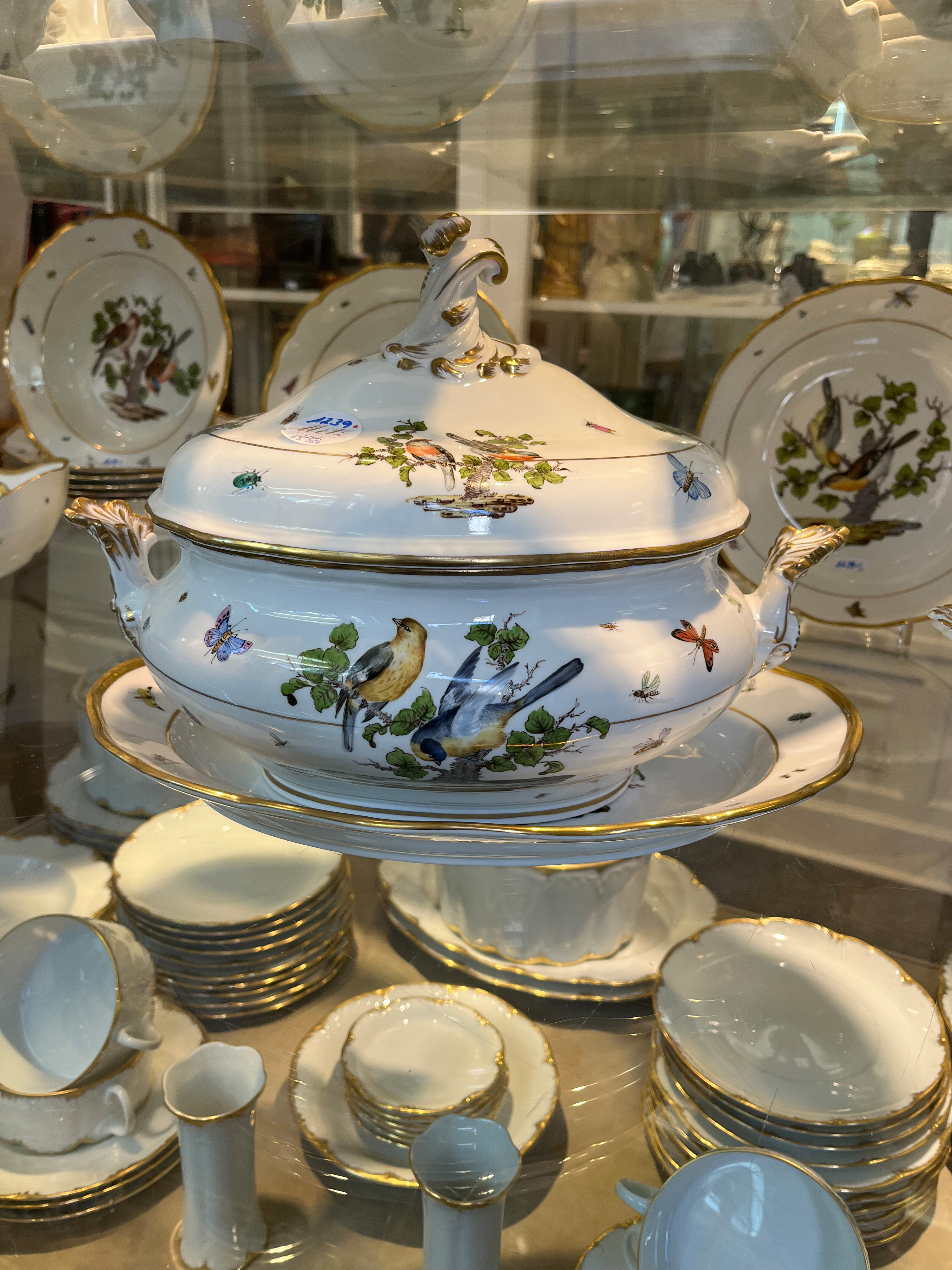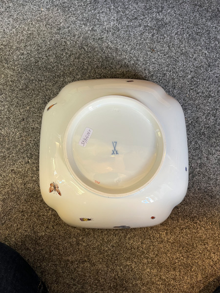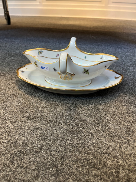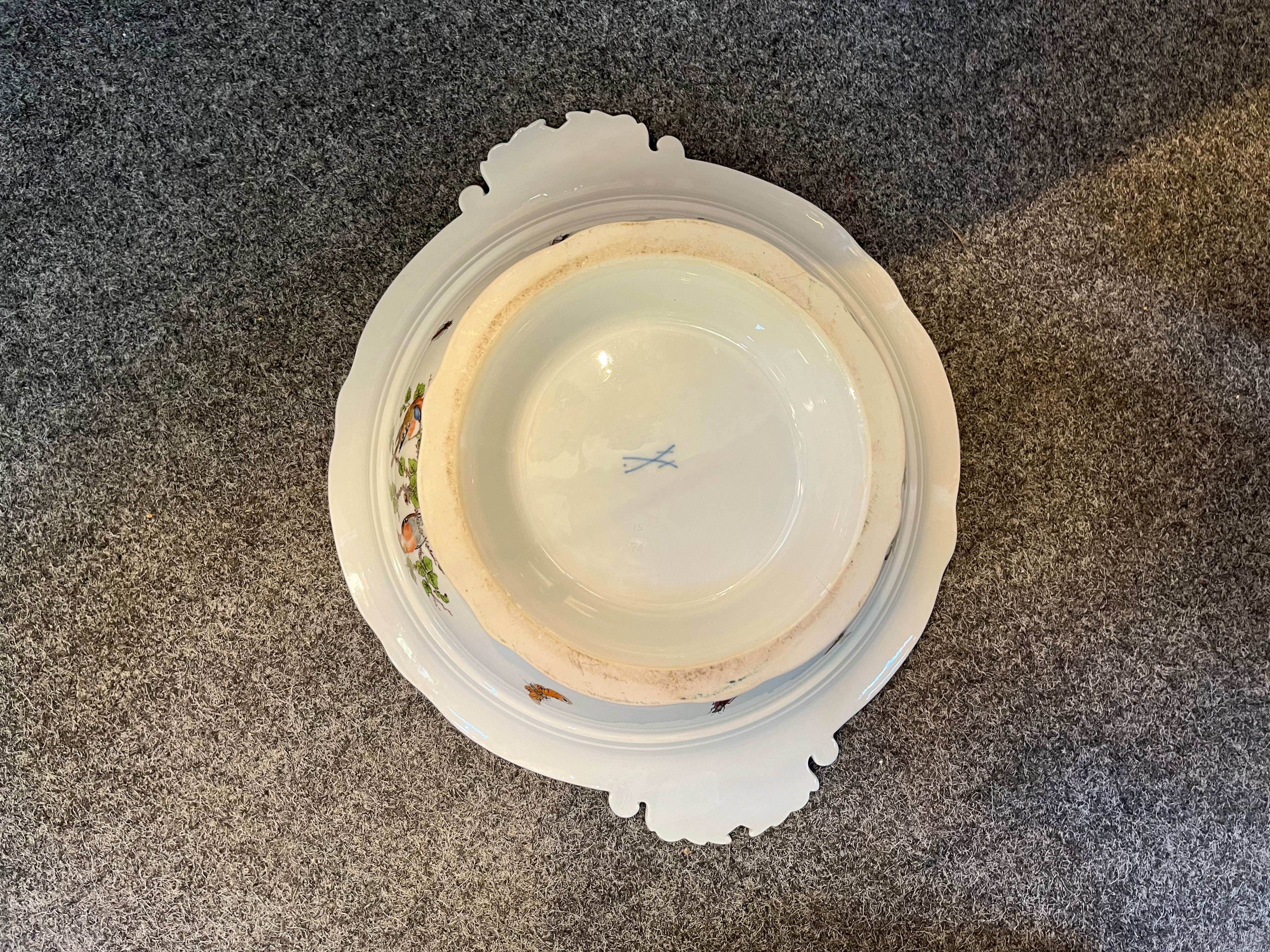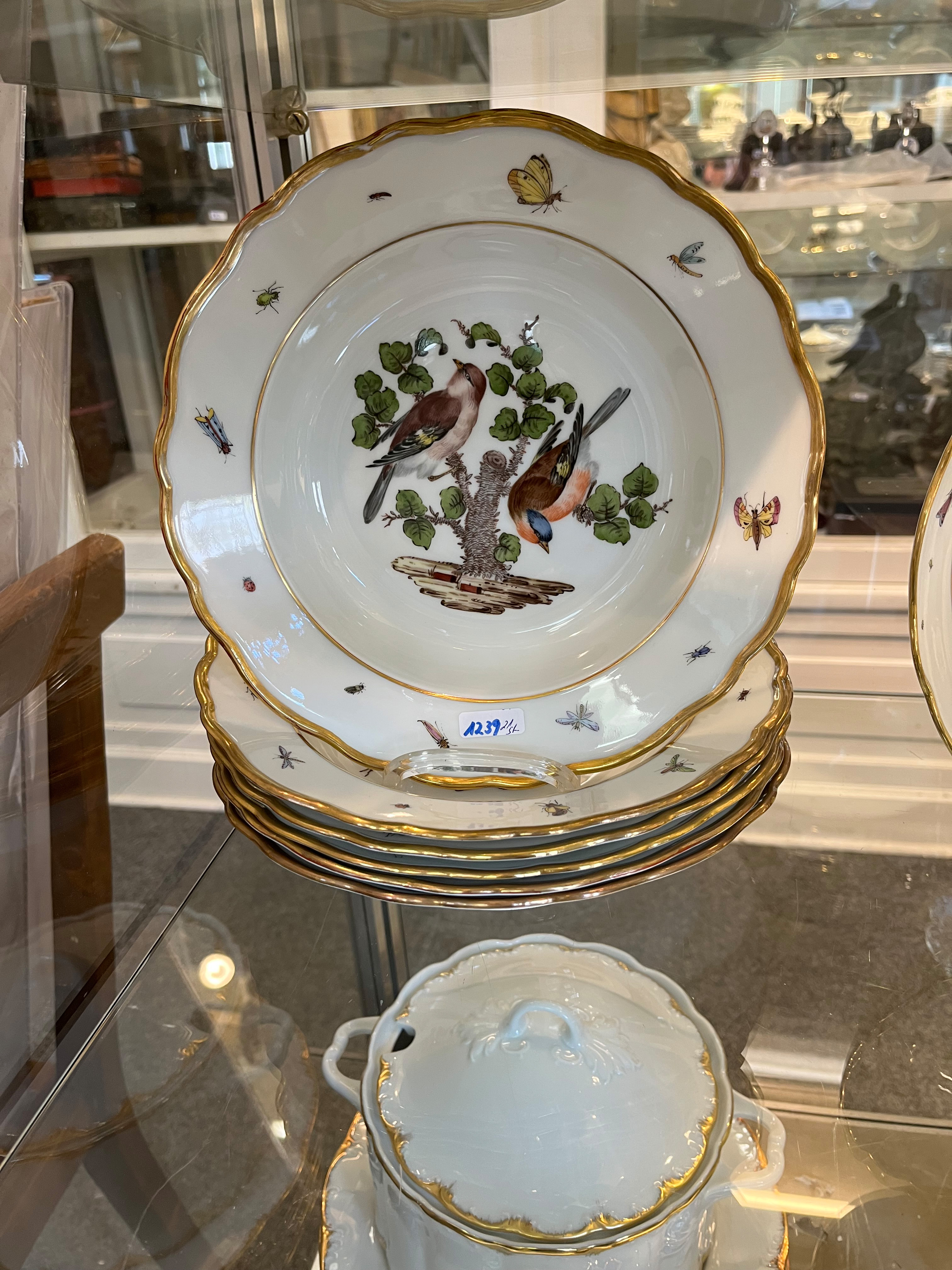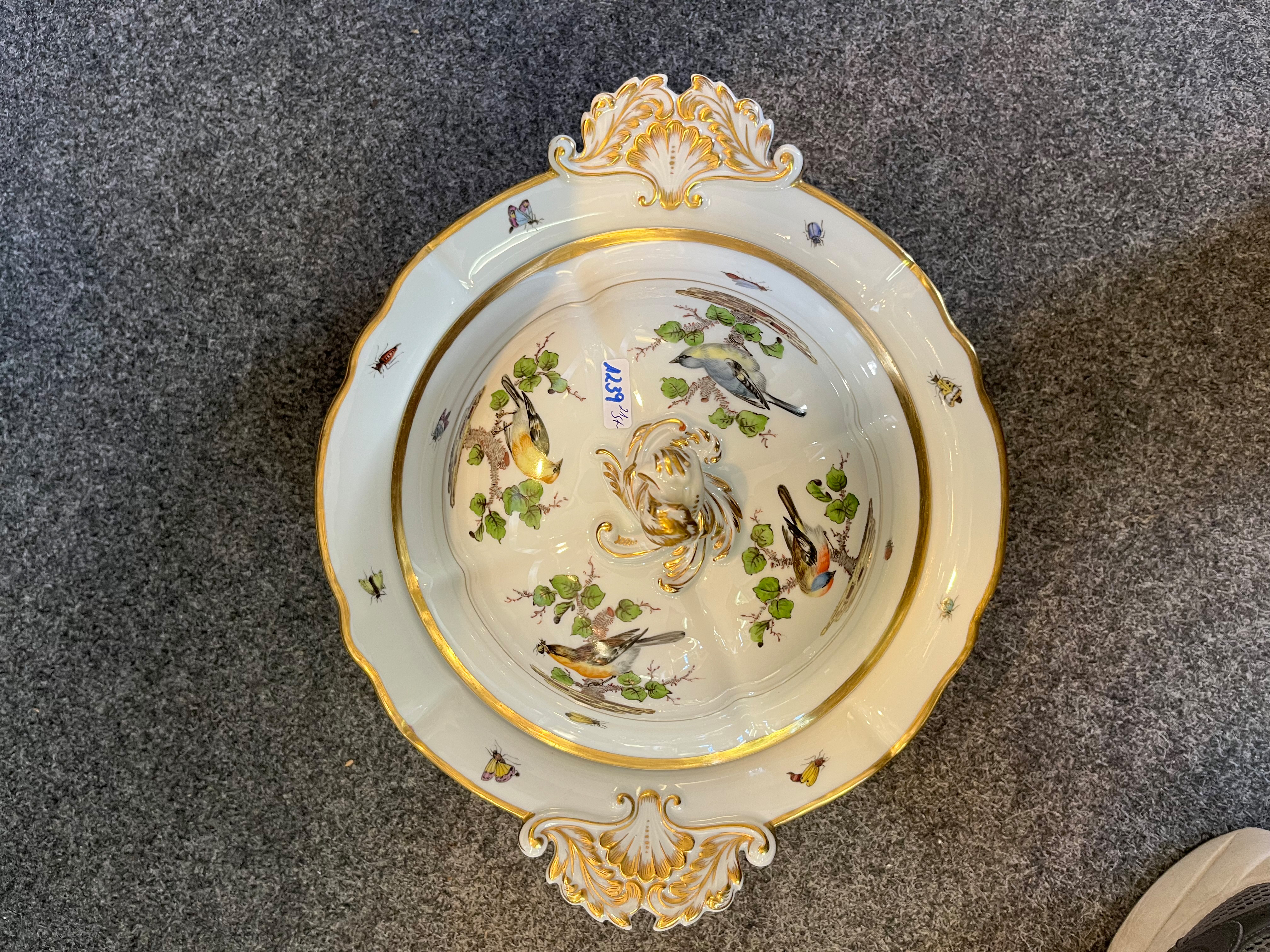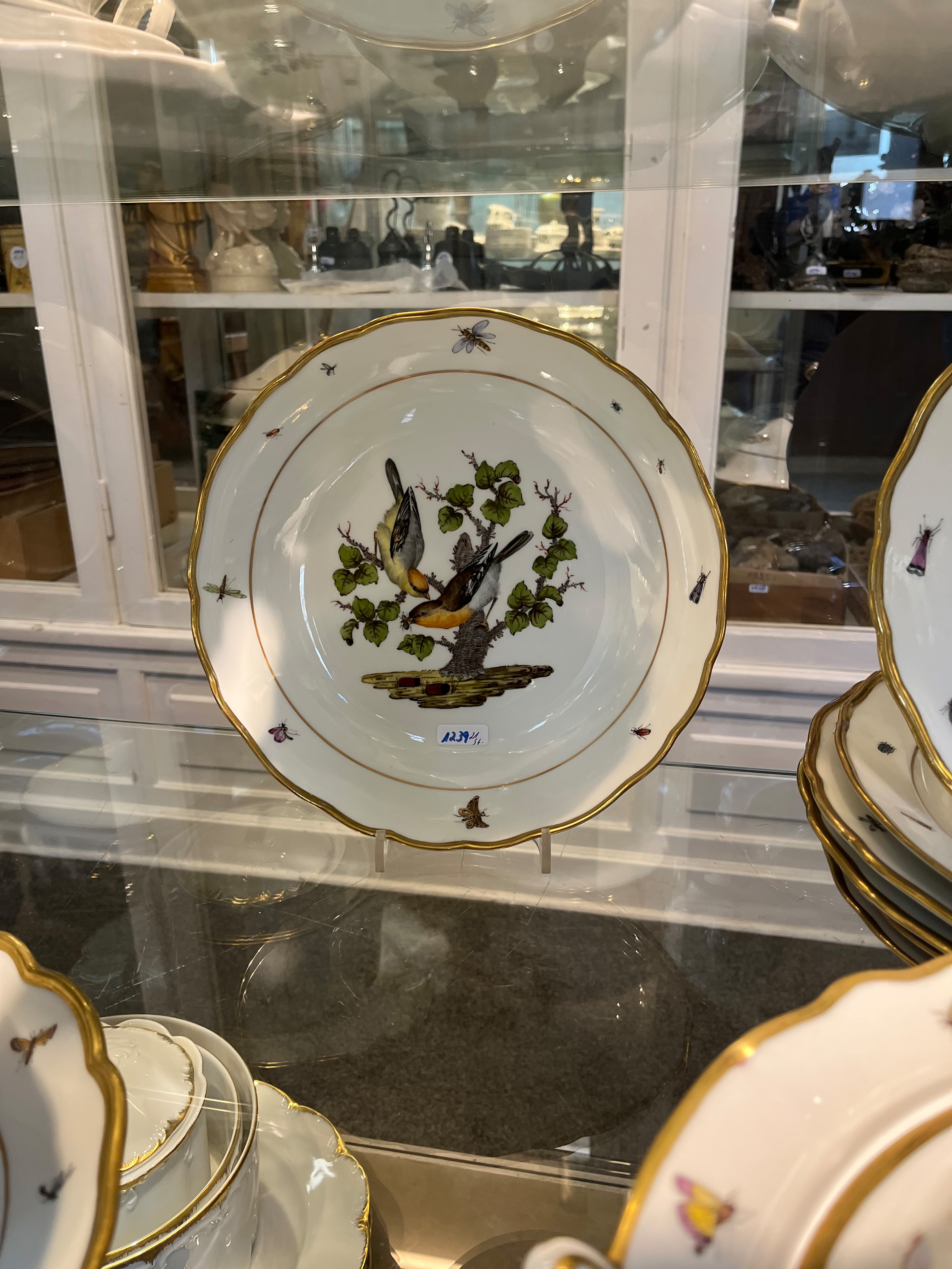 - Katalog-Nr: 123921-tlgs. Prunkservice. Meissen Pfeifferzeit 1924–34. Porzellan, exzellent bunt bemalt mit heimischen Vögeln auf Ästen, umgeben von Insekten, Ränder gold gesäumt; am Boden unterglasurblaue Schwertermarke. Bestehend aus: Sechs Speiseteller (D=je 24,5 cm), sechs Suppenteller (D=je 24 cm), eine Saucière (H=9,5 cm, B=24 cm, T=19 cm), eine große ovale Terrine (H=26 cm, B=35 cm, T=22 cm), eine ovale Platte (35 x 25 cm), eine runde Gemüseschüssel mit Deckel (H=18 cm, D=27 cm), eine quadratische Schüssel (H=10 cm, B=23 cm), ein Paar ovale Schalen (je 25 x 17 cm) und ein Paar runde Schalen (D=je 25 cm).o.L.