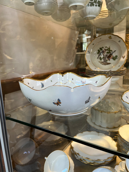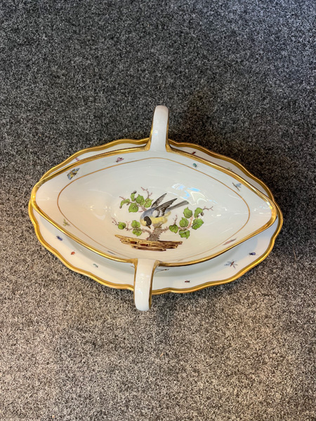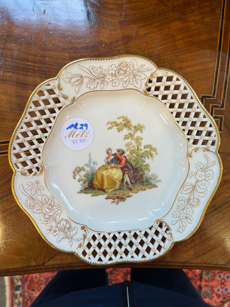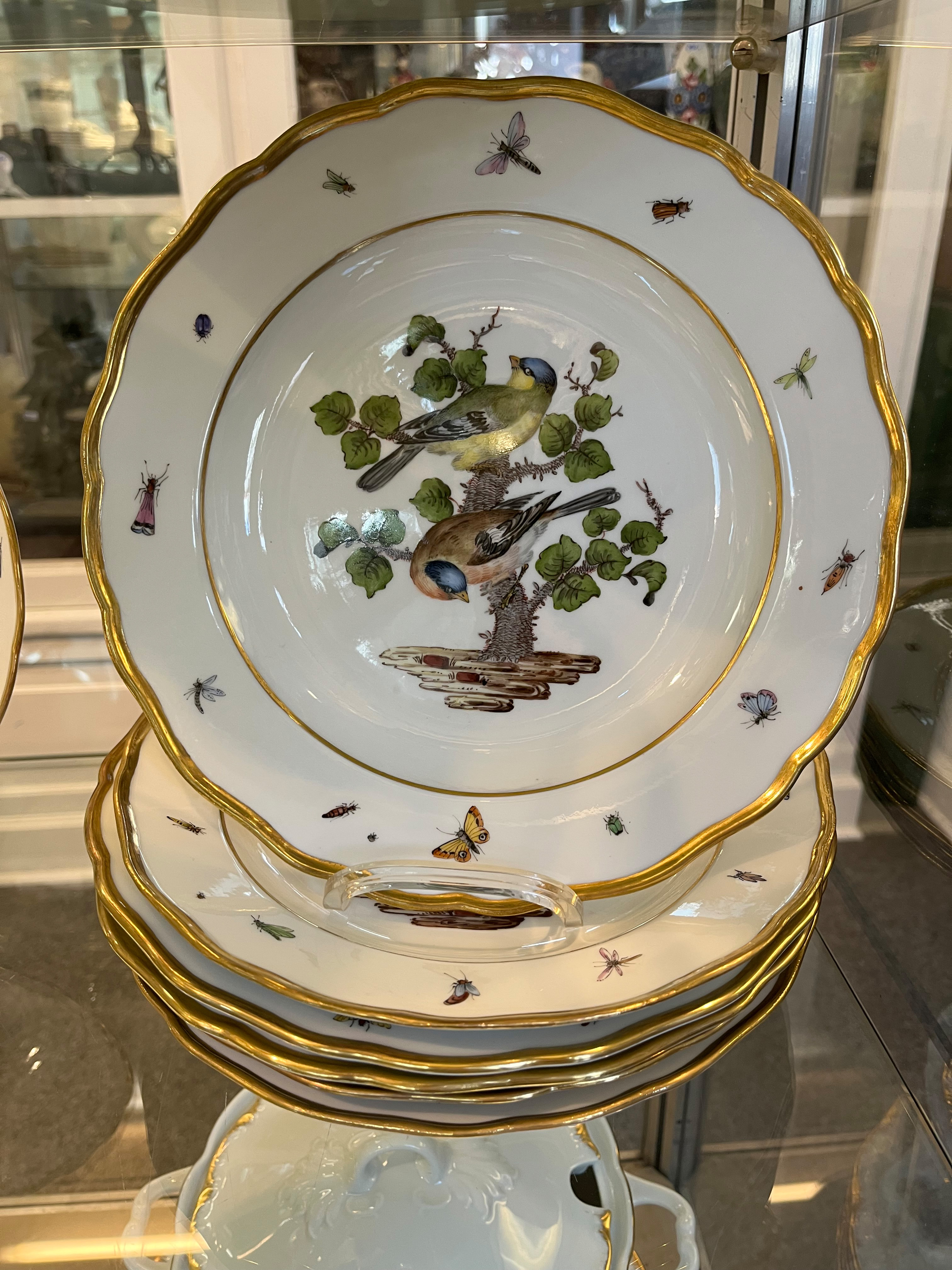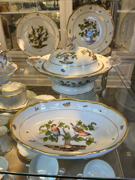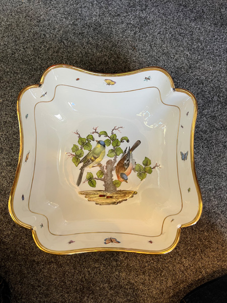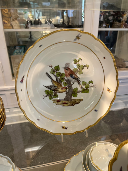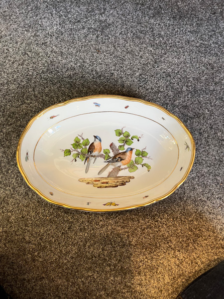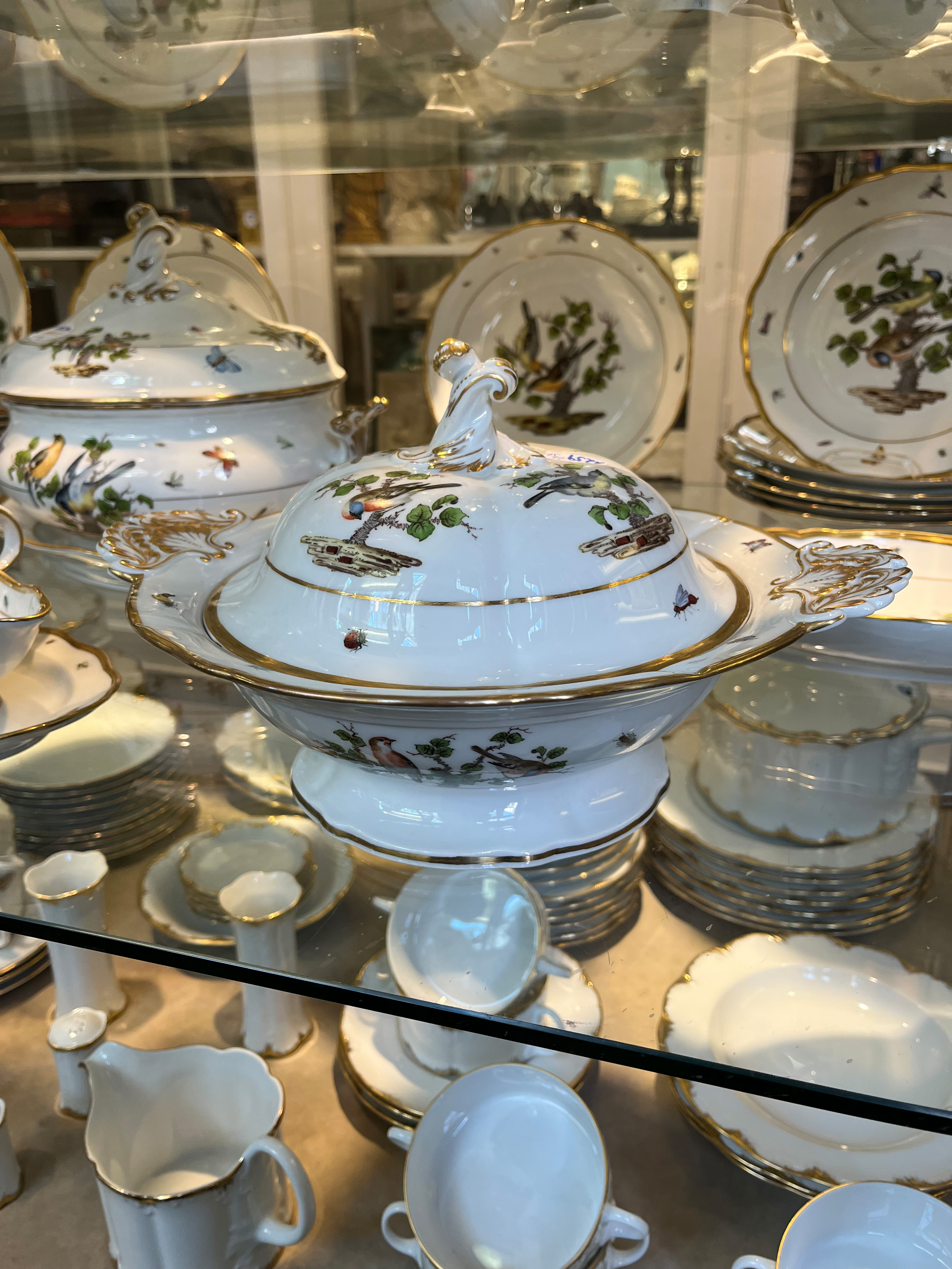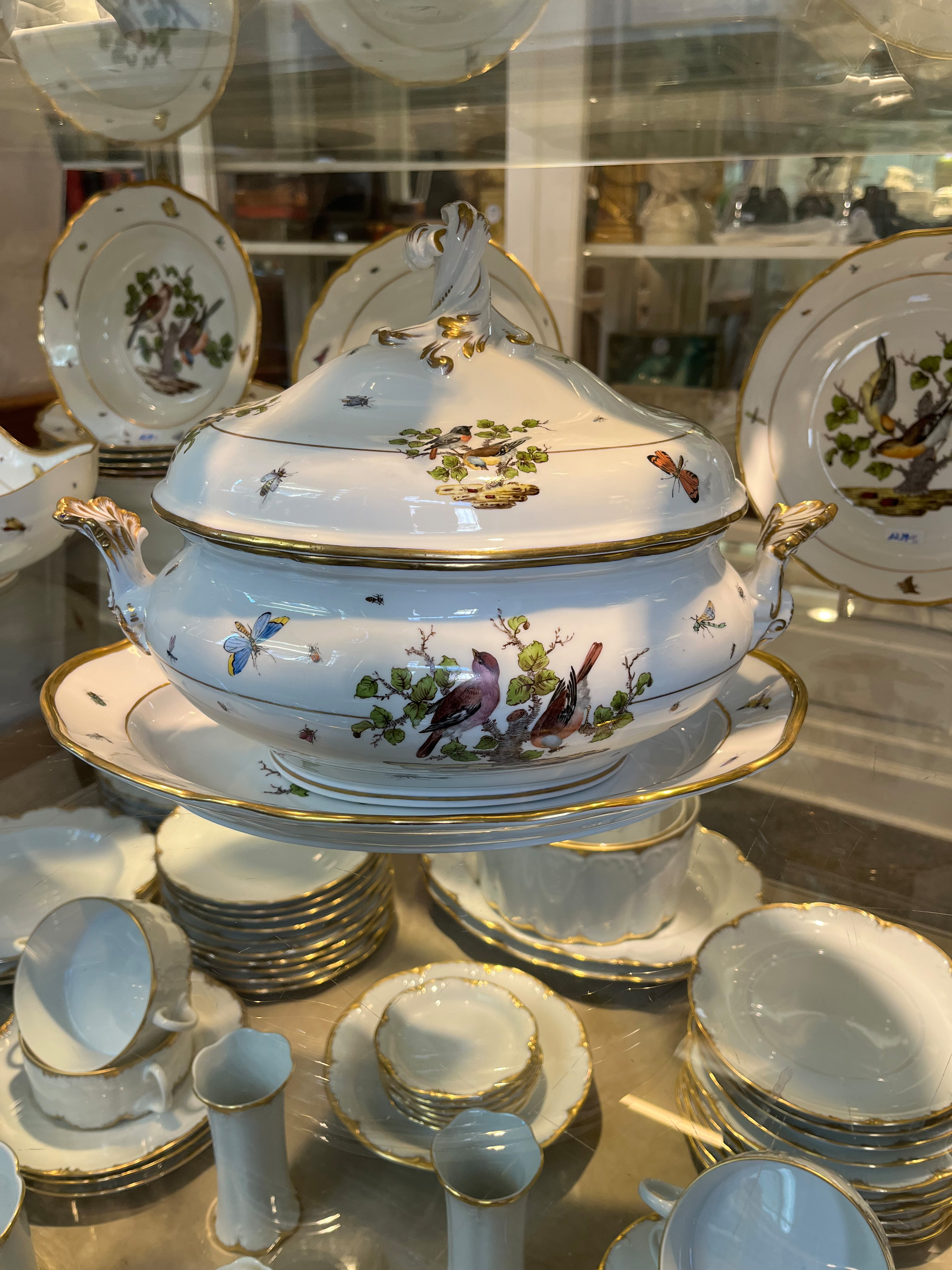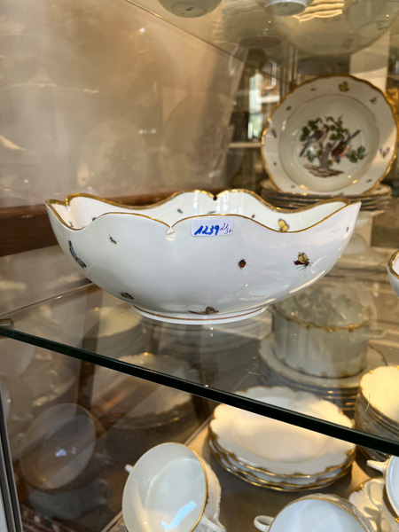 - Katalog-Nr: 123921-tlgs. Prunkservice. Meissen Pfeifferzeit 1924–34. Porzellan, exzellent bunt bemalt mit heimischen Vögeln auf Ästen, umgeben von Insekten, Ränder gold gesäumt; am Boden unterglasurblaue Schwertermarke. Bestehend aus: Sechs Speiseteller (D=je 24,5 cm), sechs Suppenteller (D=je 24 cm), eine Saucière (H=9,5 cm, B=24 cm, T=19 cm), eine große ovale Terrine (H=26 cm, B=35 cm, T=22 cm), eine ovale Platte (35 x 25 cm), eine runde Gemüseschüssel mit Deckel (H=18 cm, D=27 cm), eine quadratische Schüssel (H=10 cm, B=23 cm), ein Paar ovale Schalen (je 25 x 17 cm) und ein Paar runde Schalen (D=je 25 cm).o.L.