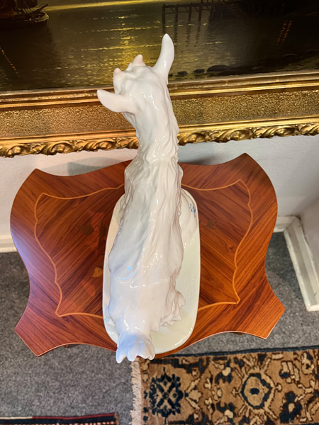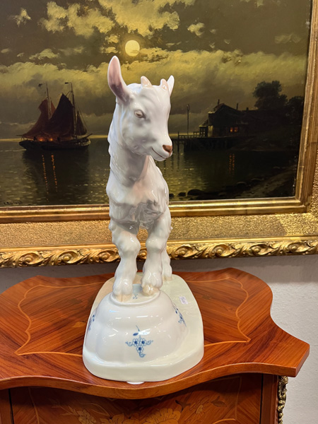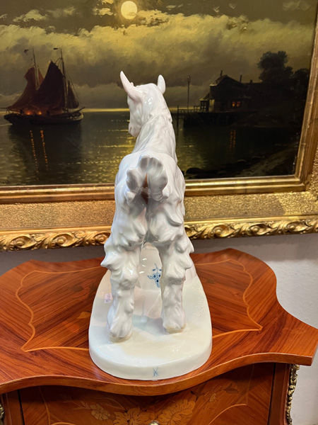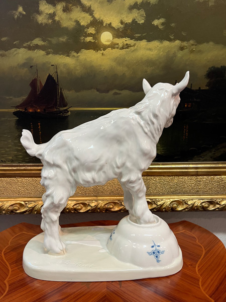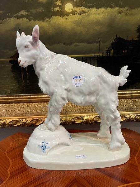 - Katalog-Nr: 1227Zicklein auf zerbrochener Zwiebelmusterschale. Meissen 20. Jh. Porzellan, sparsam bemalt, verso am Sockel unterglasurblaue Schwertermarke, Formnummer „V. 107“ . Entwurf und sign. E.(rich) Hösel, H=32 cm.o.L.