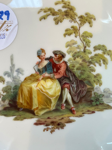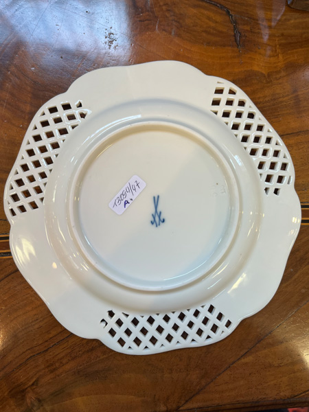 - Katalog-Nr: 1229Dessertteller. Meissen 19. Jh. Porzellan, bunt bemalt mit Watteauszene in Parklandschaft, Fahne mit Reliefblüten, gold gesäumt; verso unterglasurblaue Schwertermarke, D=19 cm.o.L.