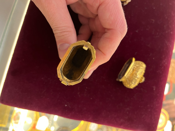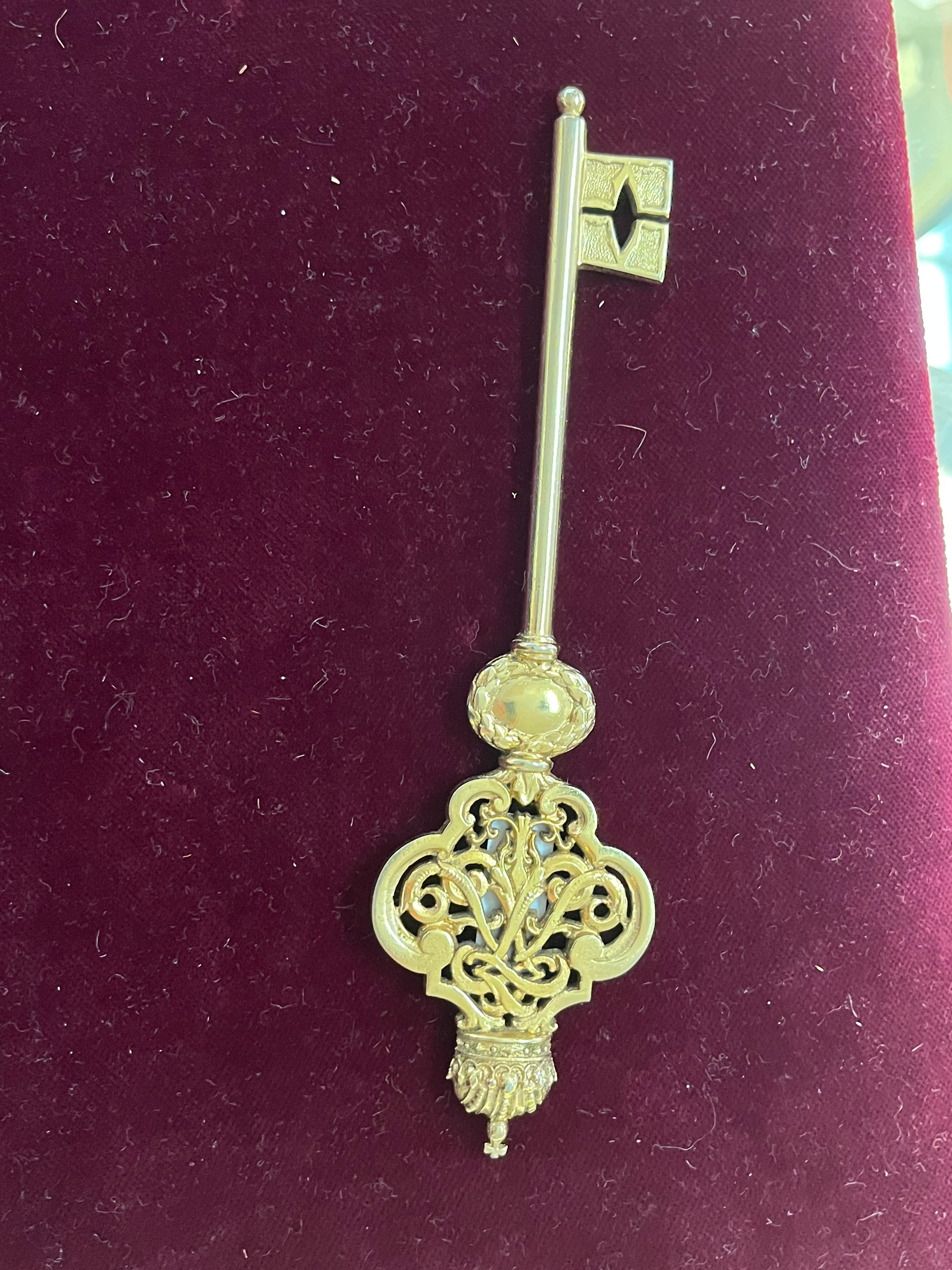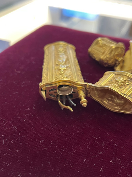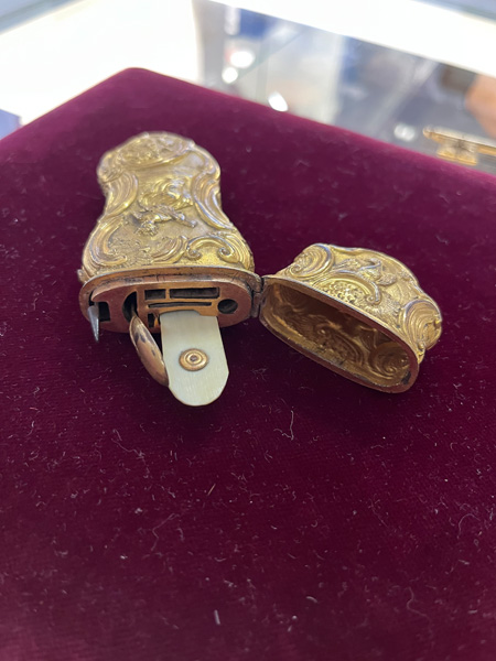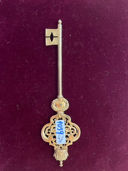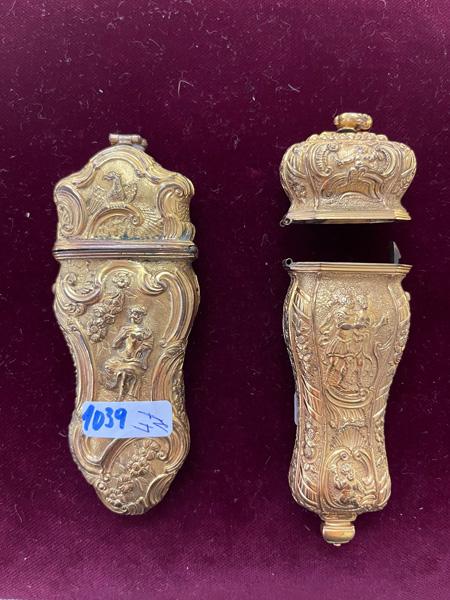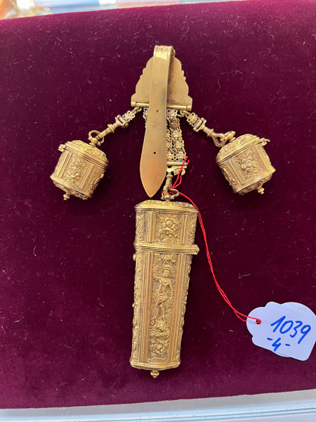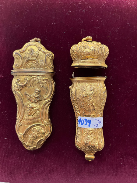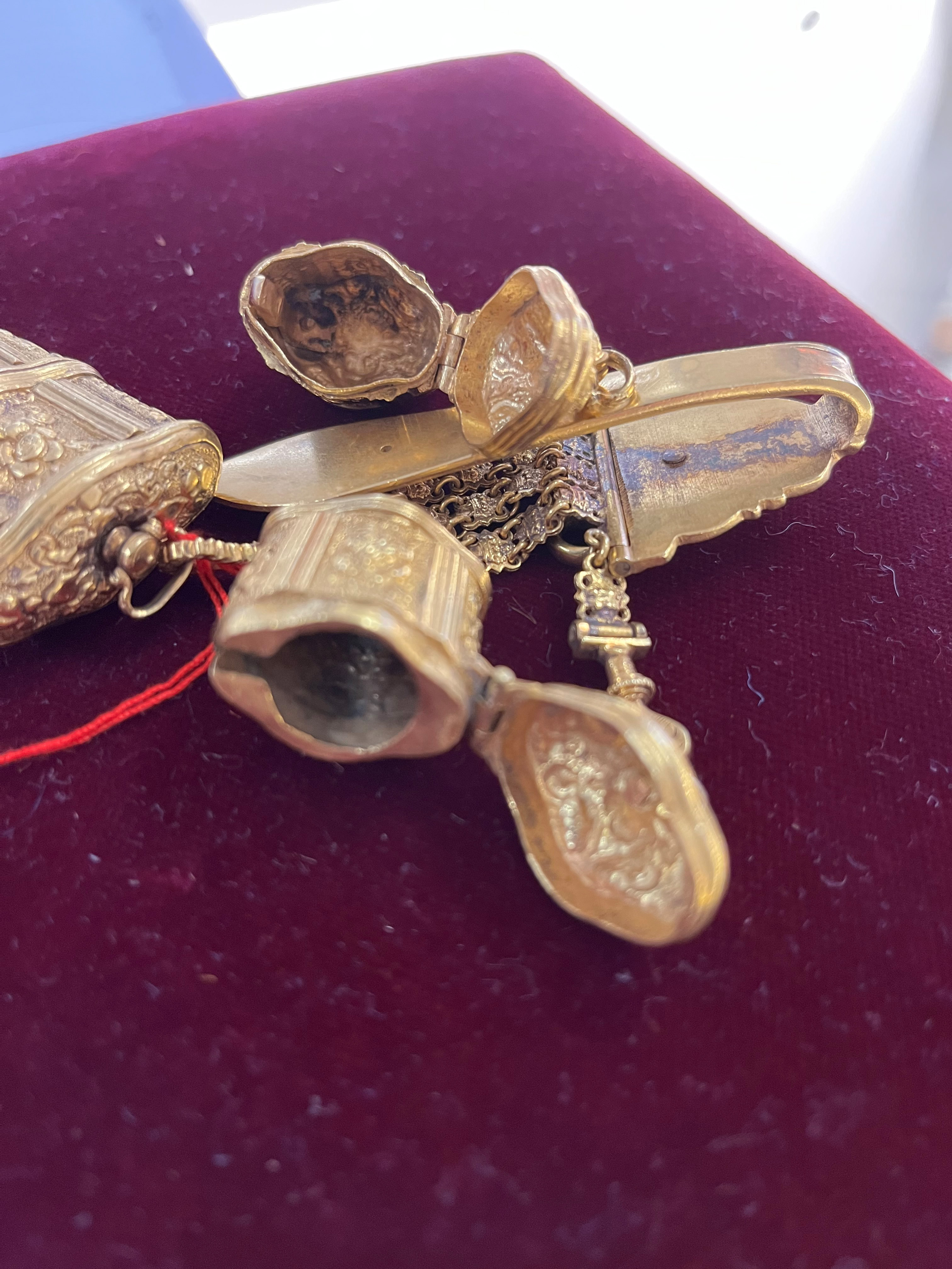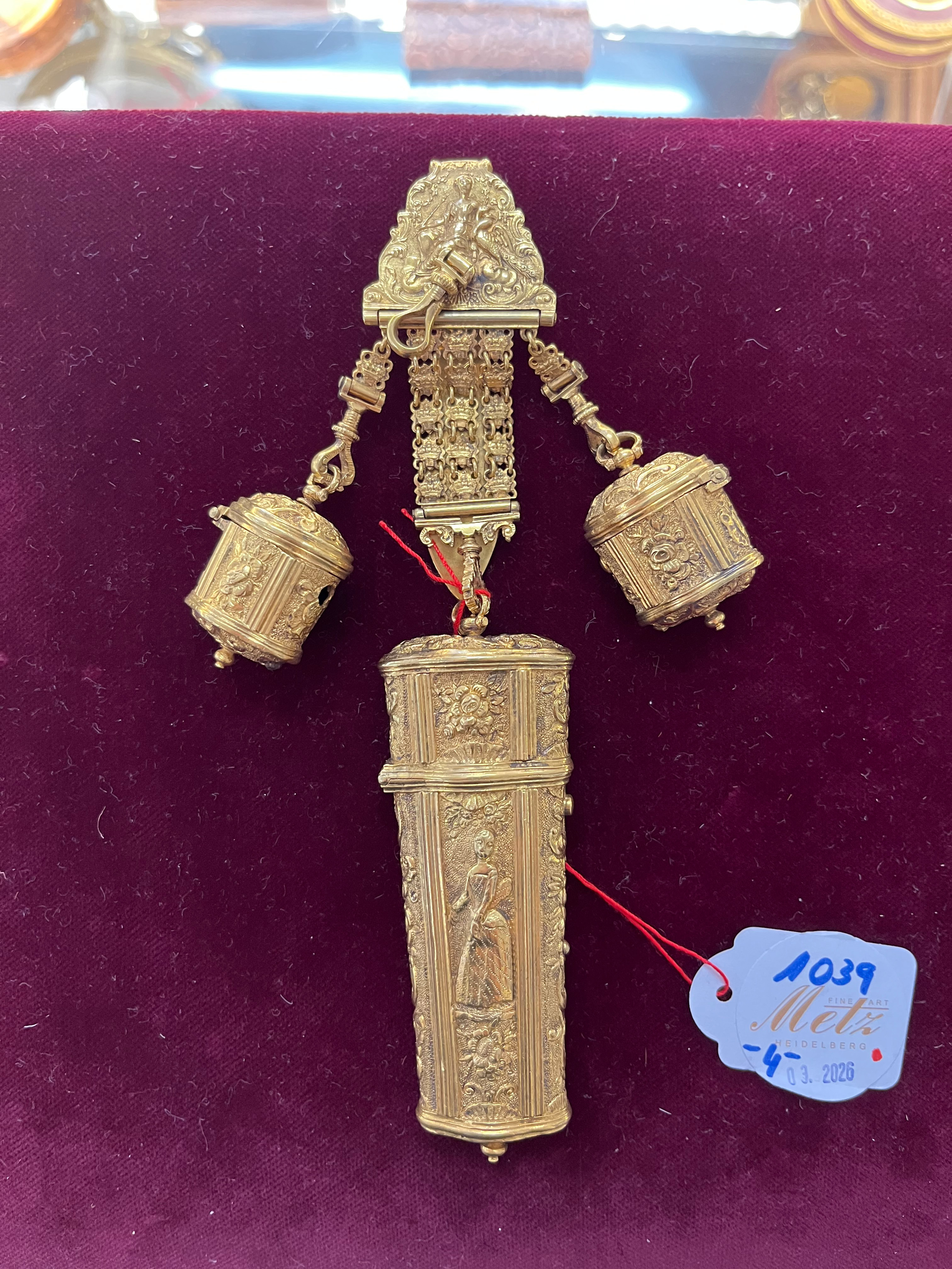 - Katalog-Nr: 1039Drei Châtelaines und ein Kammerherrenschlüssel. Deutsch 18./19. Jh. Metall vergoldet; eine mit Gürtelhaken und zwei Döschen, verziert mit romantischen Szenen, teilw. mit Inhalt, L=11 bis 15 cm.o.L.