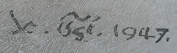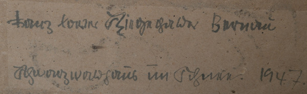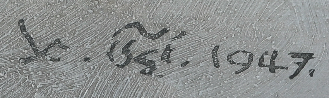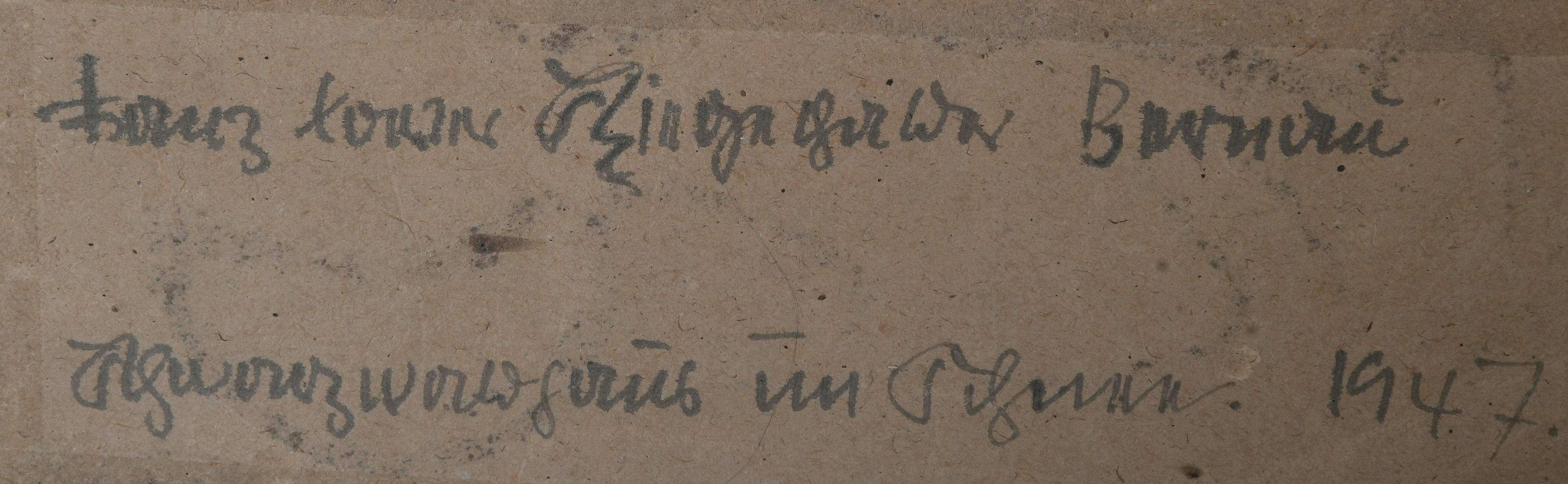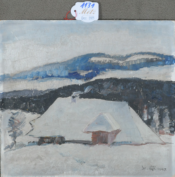 - Katalog-Nr: 1131Maler des 20. Jhs. „Schwarzwaldhaus im Schnee“. Öl/Malkarton, re./u./monogr., verso unleserlich sign./bez. „Bernau“/dat. 1947, 22,5 x 24,5 cm.o.L.