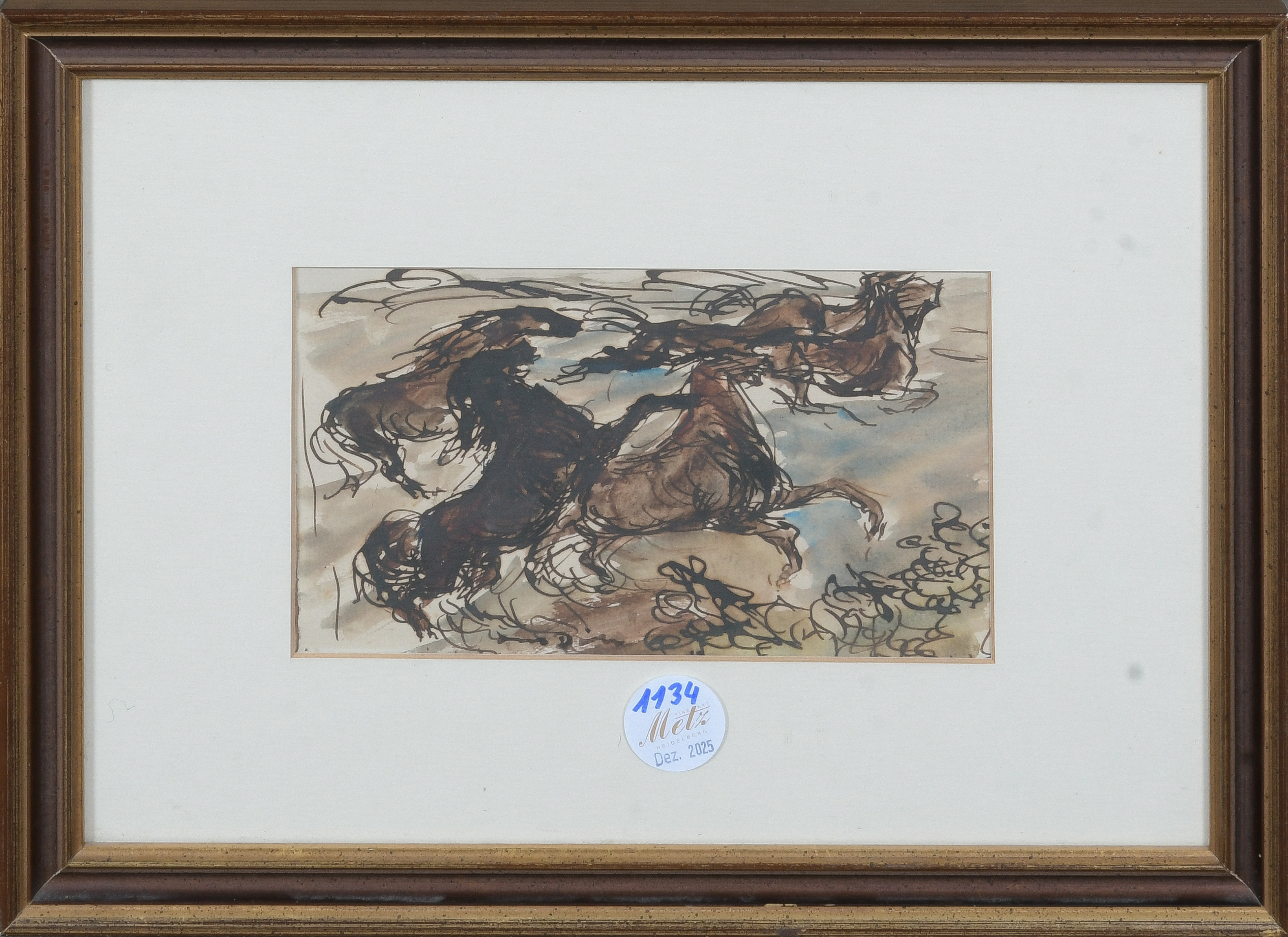 - Katalog-Nr: 1134Otto Dill (1884-1957). Galoppierende Pferde. Lavierte Tuschfederzeichnung, u./mittig/sign., mit Passepartout hi./Gl. gerahmt, 12 x 21 cm.o.L.
