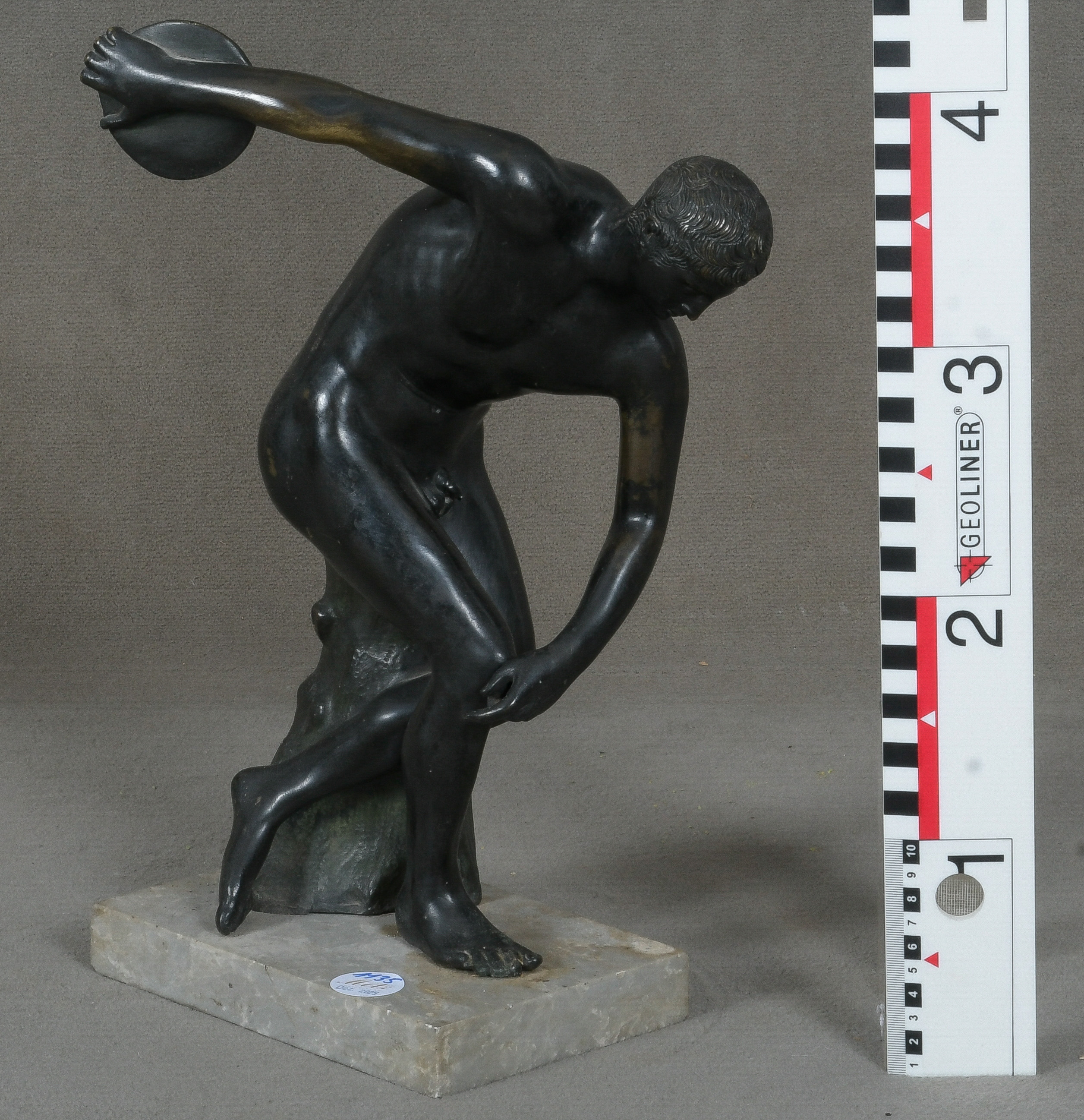 - Katalog-Nr: 1135Diskuswerfer nach Myrons „Discobolos". Wohl deutsch 19./20. Jh. Bronze, auf Marmorsockel, H=42 cm.o.L.