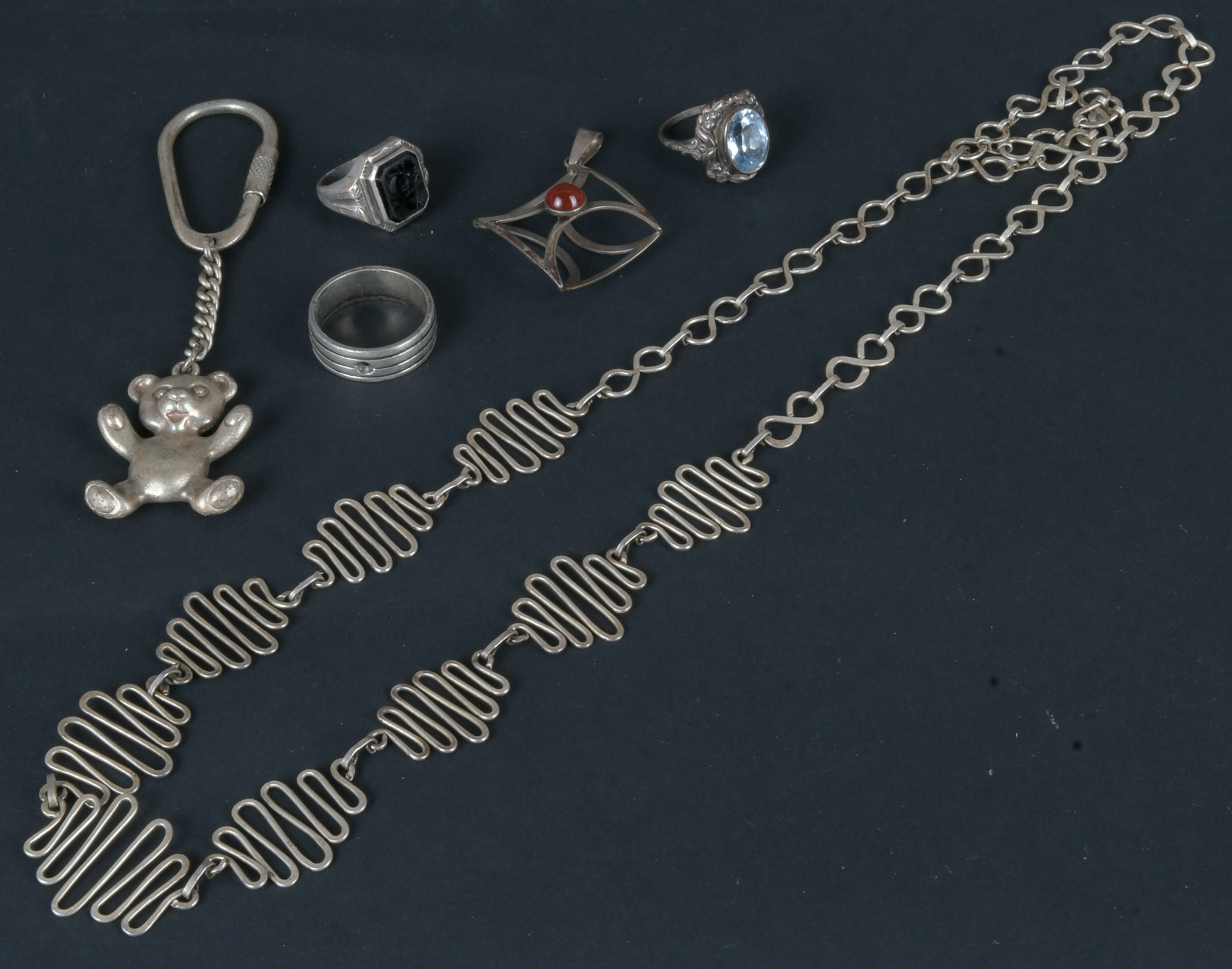 - Katalog-Nr: 1140Konvolut Schmuck: Anhänger, Halskette (L=56 cm) und Ringe (Größe 48 bis 61). Silber, teilw. mit Steinbesatz, Gesamtgewicht ca. 60,00 g.o.L.