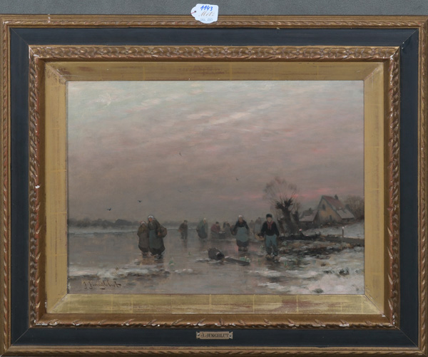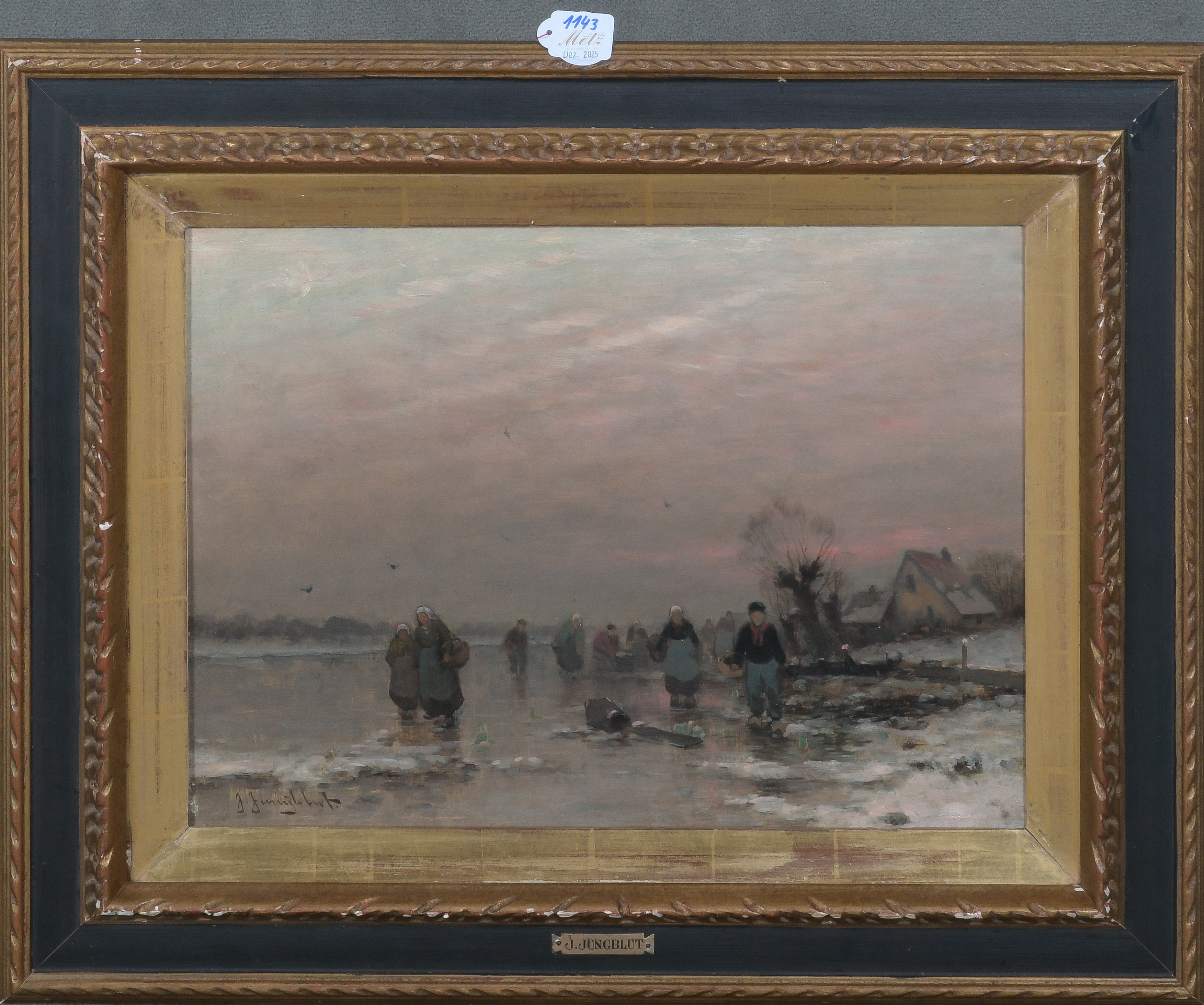 - Katalog-Nr: 1143Johann Jungblut (1860-1912). Fischverkauf am winterlichen Ufer. Öl/Lw., li./u./sign., gerahmt, 33,5 x 44,5 cm.o.L.