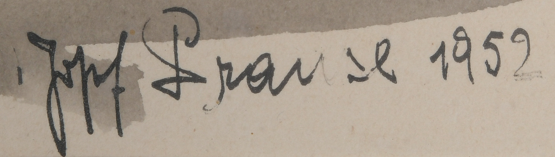 - Katalog-Nr: 1146Josef Prause (1916-2007). Liegender weiblicher Akt. Tuschfederzeichnung, re./u./sign./dat. 1952, mit Passepartout hi./Gl. gerahmt, 19,5 x 41 cm.o.L.