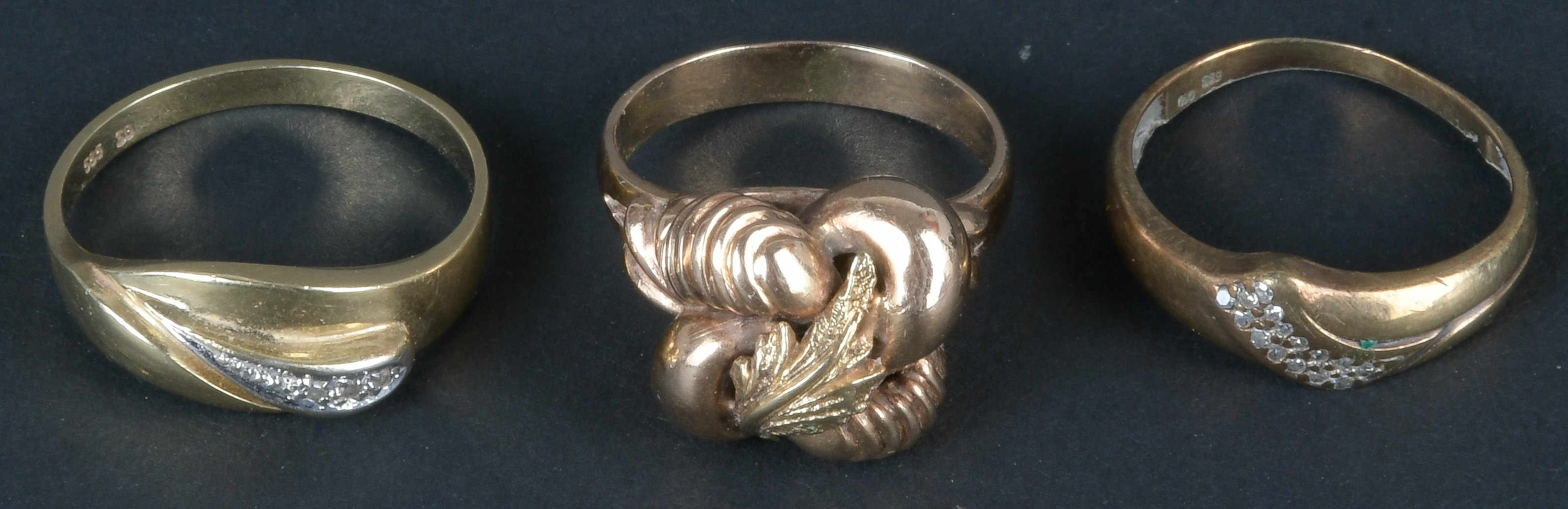 - Katalog-Nr: 1149Drei Ringe. 14 kt Gold, besetzt mit Diamantsplittern, Gesamtgewicht ca. 13,53 g, Ringgröße 58 bis 63.o.L.