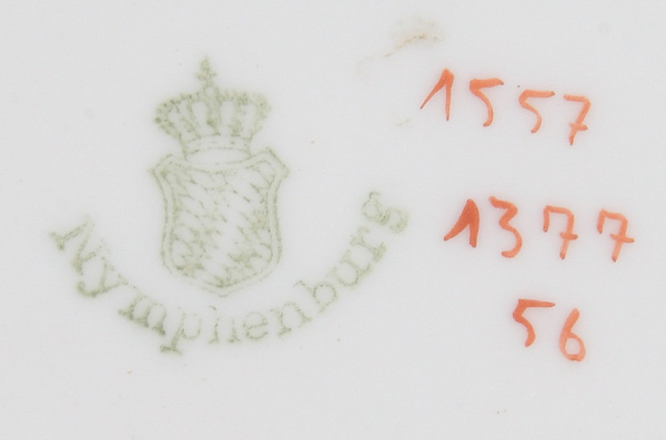- Katalog-Nr: 112915-tlgs. Kaffeeservice. Nymphenburg 20. Jh. Porzellan, mit dunklem Fond, Reserven purpurn bemalt mit Floraldekor; am Boden gemarkt. Bestehend aus: Eine Kaffeekanne (H=26 cm), ein Milchgießer (H=13 cm), sechs Tassen mit Unterschalen, sechs Kuchenteller (D=je 19 cm) und ein ovales Tablett (H=1,5 cm, B=33,5 cm, T=25 cm).o.L.