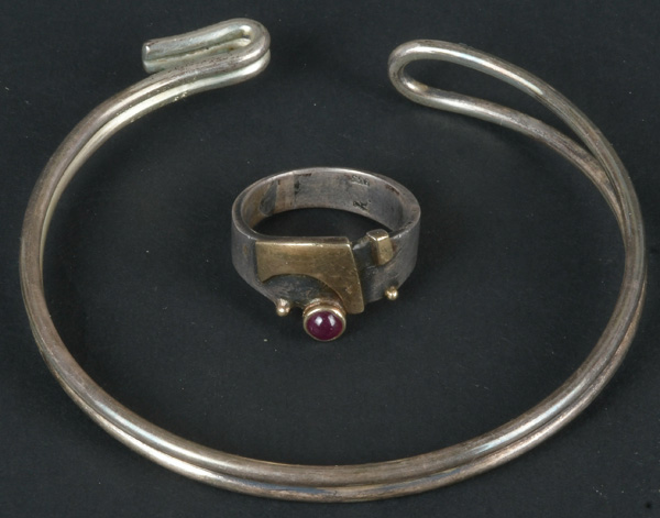 - Katalog-Nr: 1139Designer-Armreif und Ring. Wohl Dänemark 20. Jh. Ring 14 kt Gold / Silber, besetzt mit Rubincabochon, Ringgröße 58 / Armreif, Silber, ca. 18,92 g.o.L.