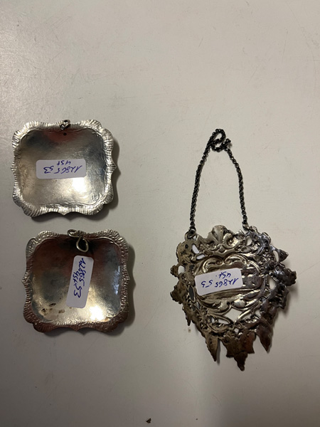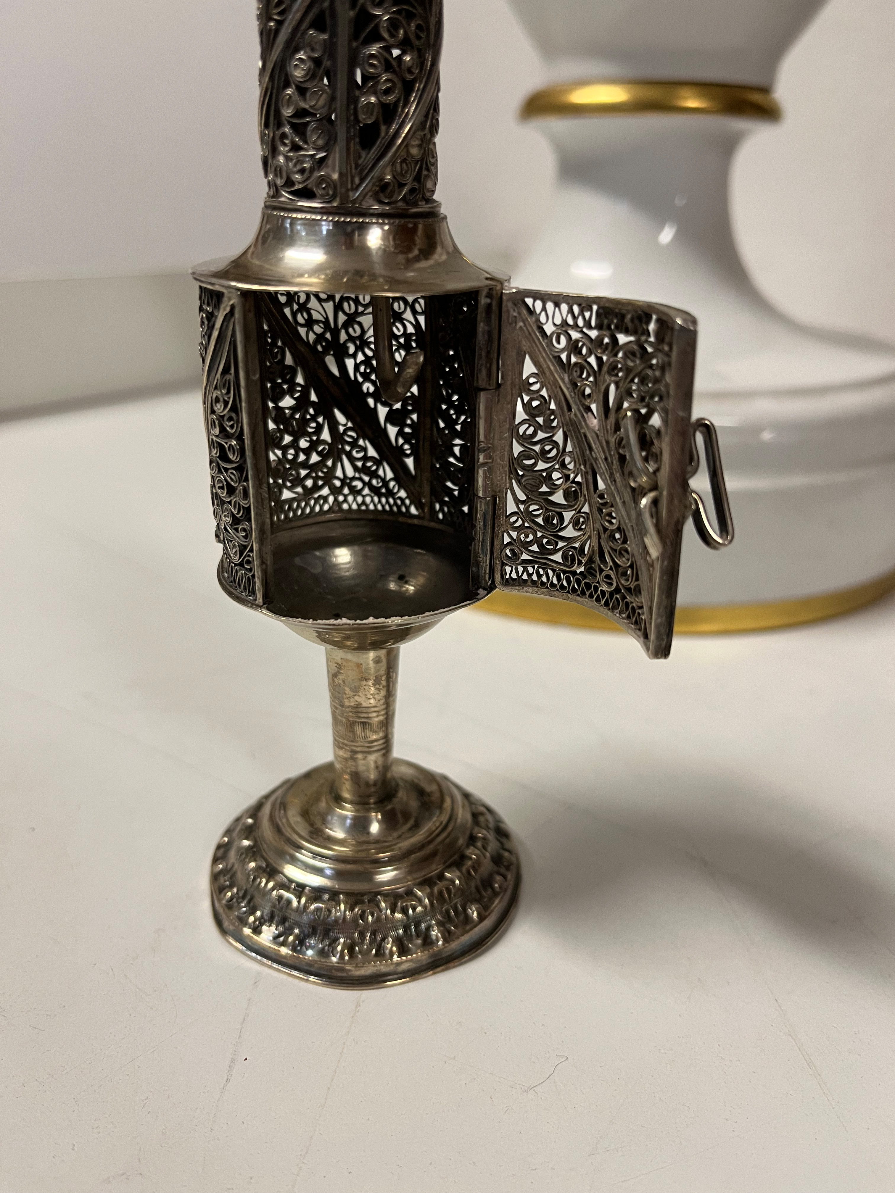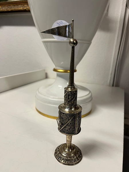 - Katalog-Nr: 46Viertlgs. Konvolut Judaica. Wohl deutsch 20. Jh. Silber, ca. 168 g, bestehend aus: Besamim-Turm (H=25,5 cm) und drei unterschiedlich beschriftete Schilder (5 x 5,5 / 7,5 x 6 cm)o.L.