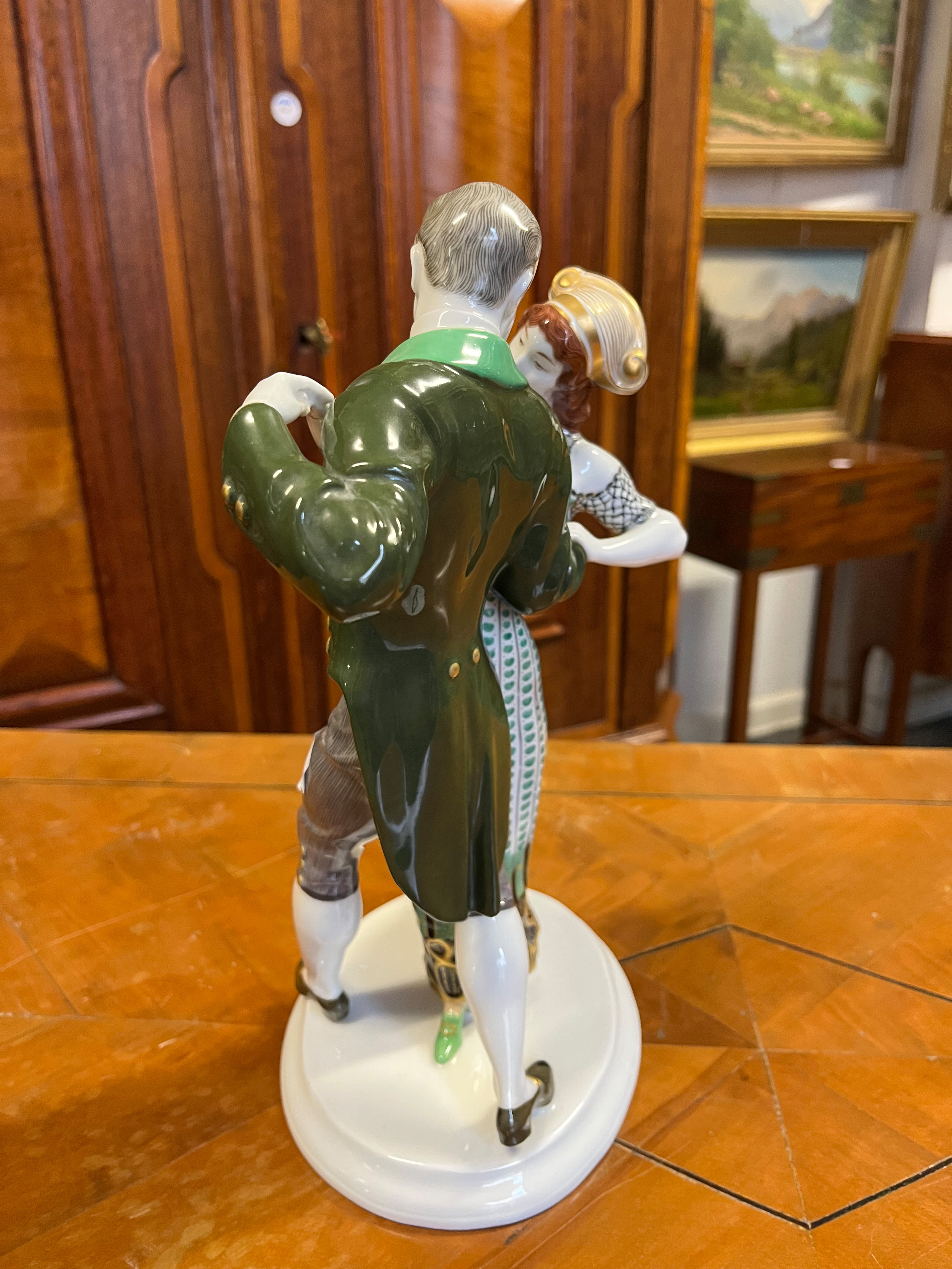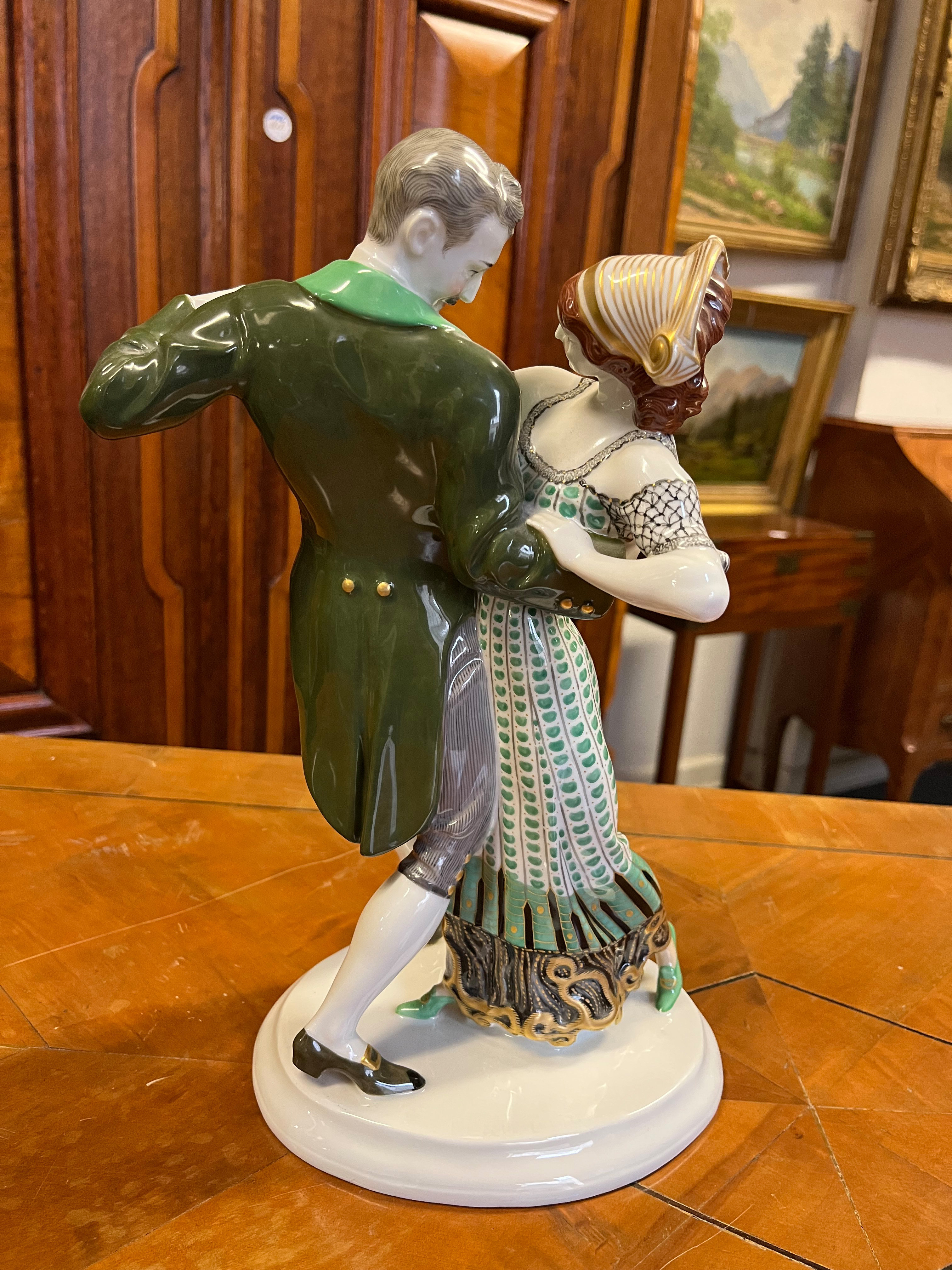 - Katalog-Nr: 50Tänzerpaar. Berlin 1915. Je stehend auf ovalem, profiliertem Sockel. Porzellan, bunt bemalt, am Boden unterglasurblaue Szeptermarke mit korallenrotem „KPM“ und Reichsapfel, Formnummer „10375“ mit Jahresbuchstabe, Staffiererziffer „140/816.f“, Entwurf und sign. Ferd.(inand) Liebermann, H=32 cm.o.L.