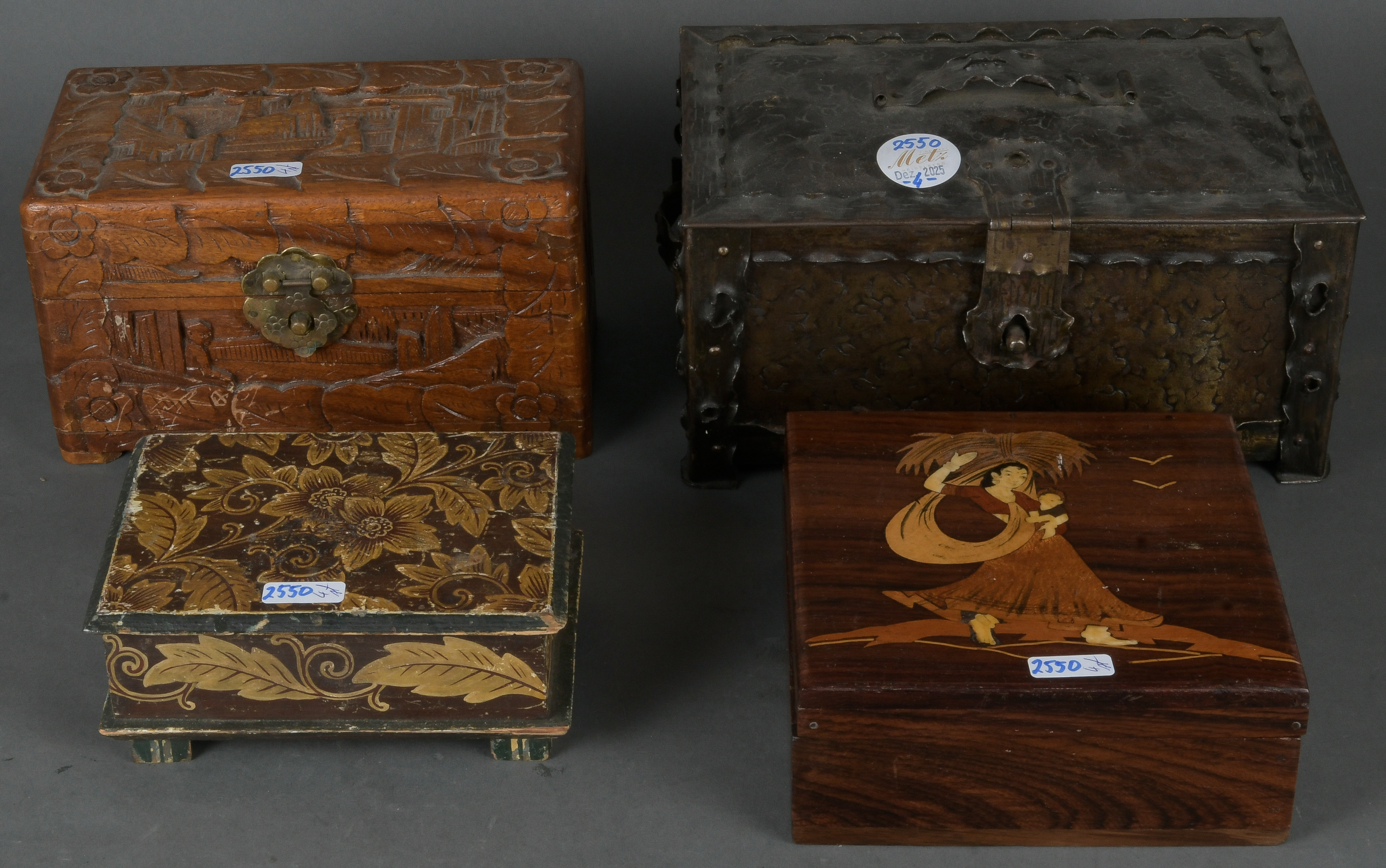 - Katalog-Nr: 2550Vier Schatullen. Asien / Deutschland 20. Jh. Massivholz, geschnitzt und teilw. bemalt bzw. Metall mit Beschlägen, H=7 cm, B=14,5 cm, T=10 cm bis H=11,5 cm, B=24 cm, T=16 cm.o.L.