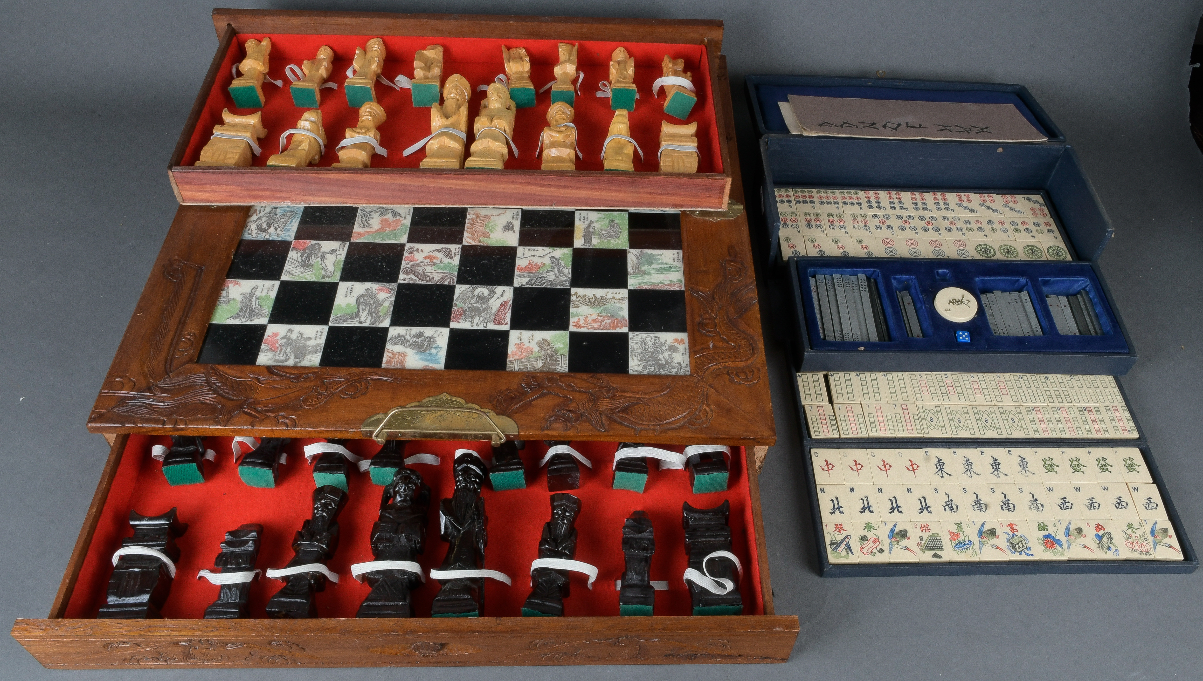 - Katalog-Nr: 2553Mahjong im Etui. Asien 20. Jh. Massivholz, geschnitzt (H=9 cm, B=28 cm, T=12 cm); dazu Schachspiel mit Holzfiguren (H=6,5 bis 13 cm) und Kunstmasse-Spielfeld (45,5 x 46 cm).o.L.