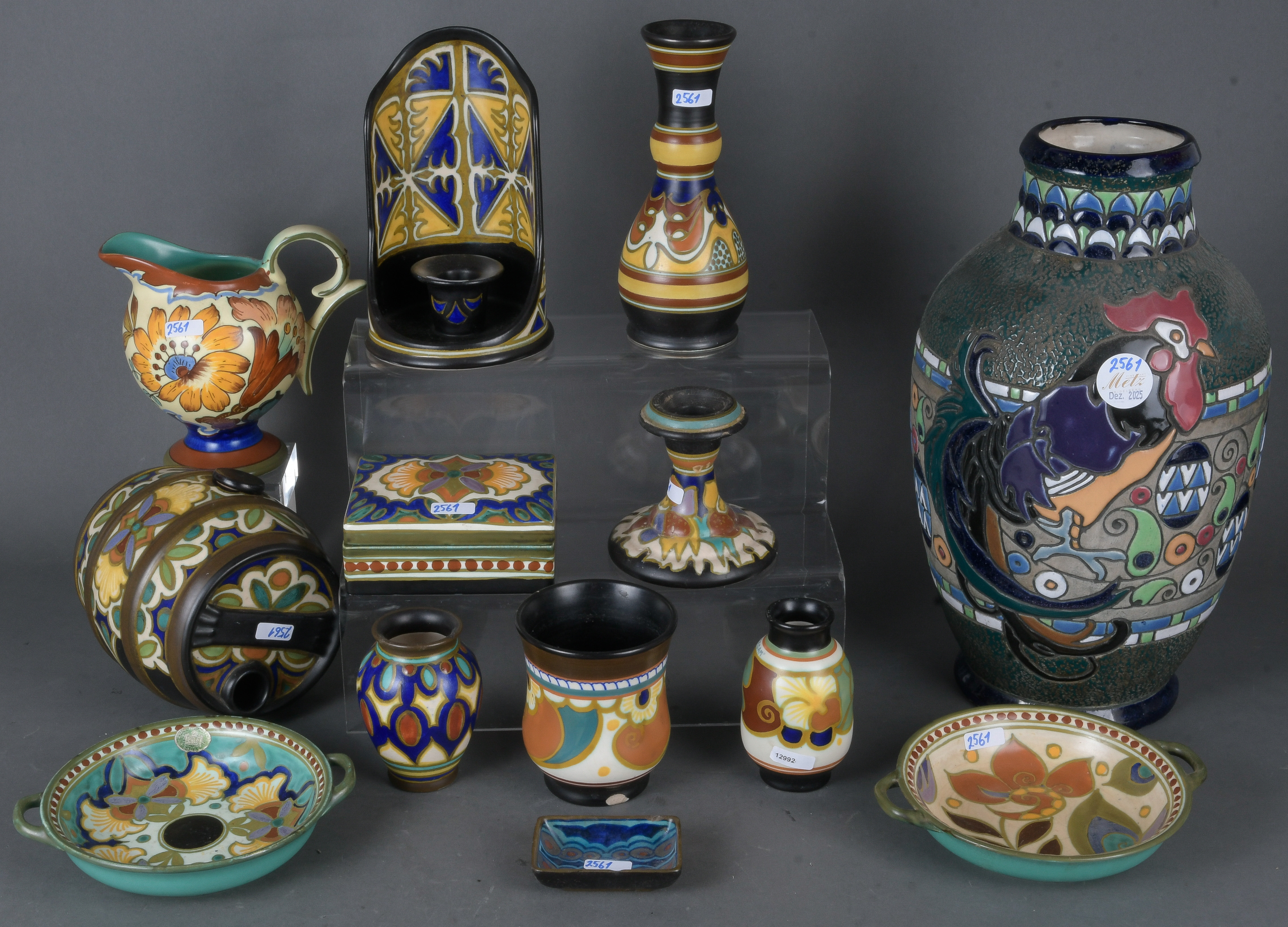 - Katalog-Nr: 2561Konvolut Keramik, u.a. Böhmen / Gouda 20. Jh. Bestehend aus: Kerzenleuchter, Krug, Schalen und Vasen, H=2 bis 35 cm.o.L.
