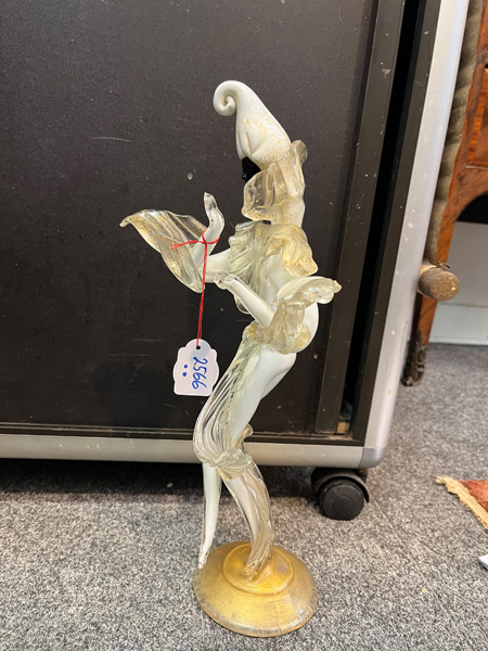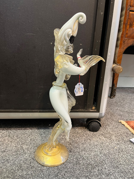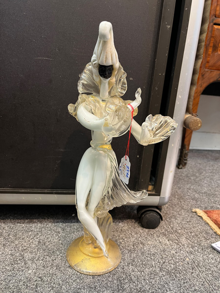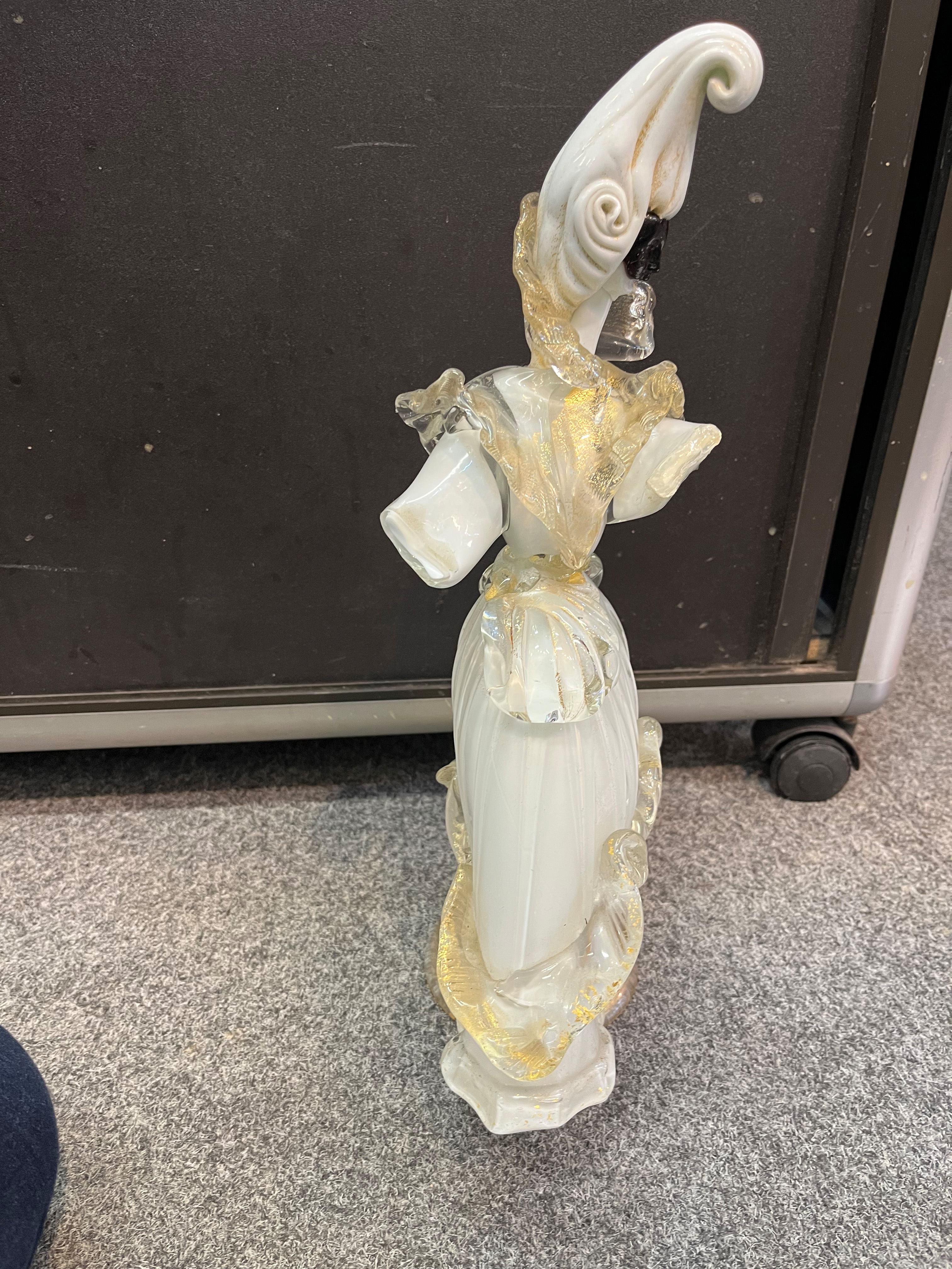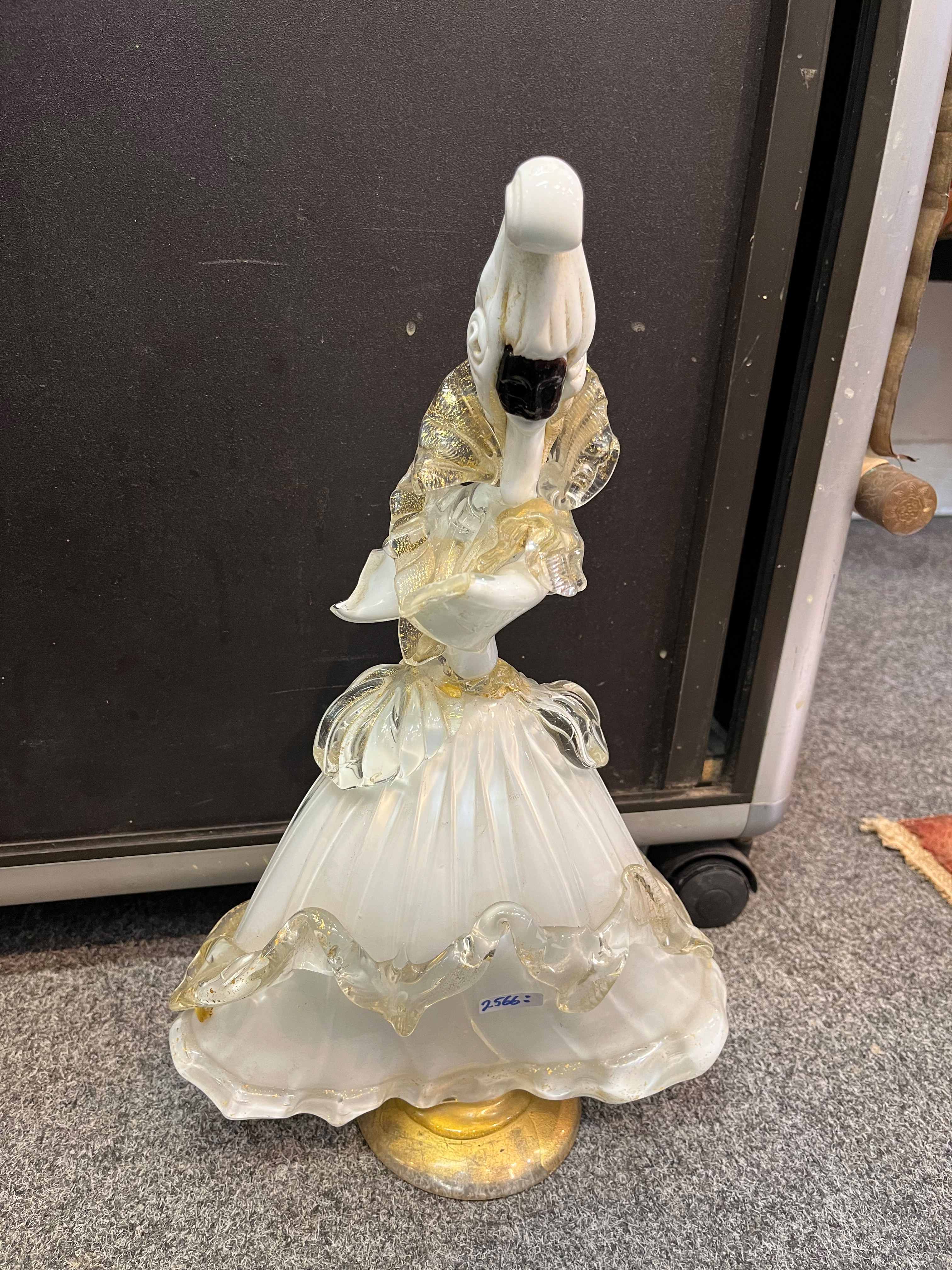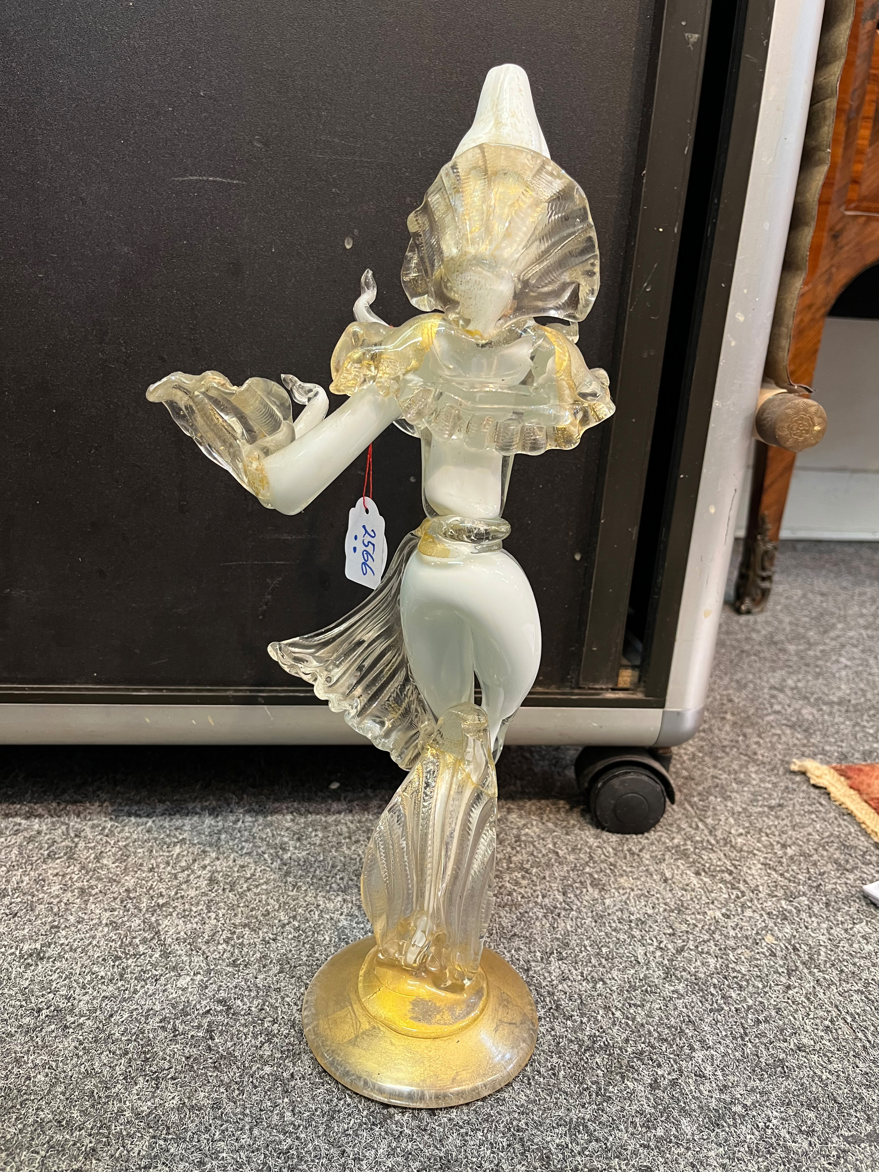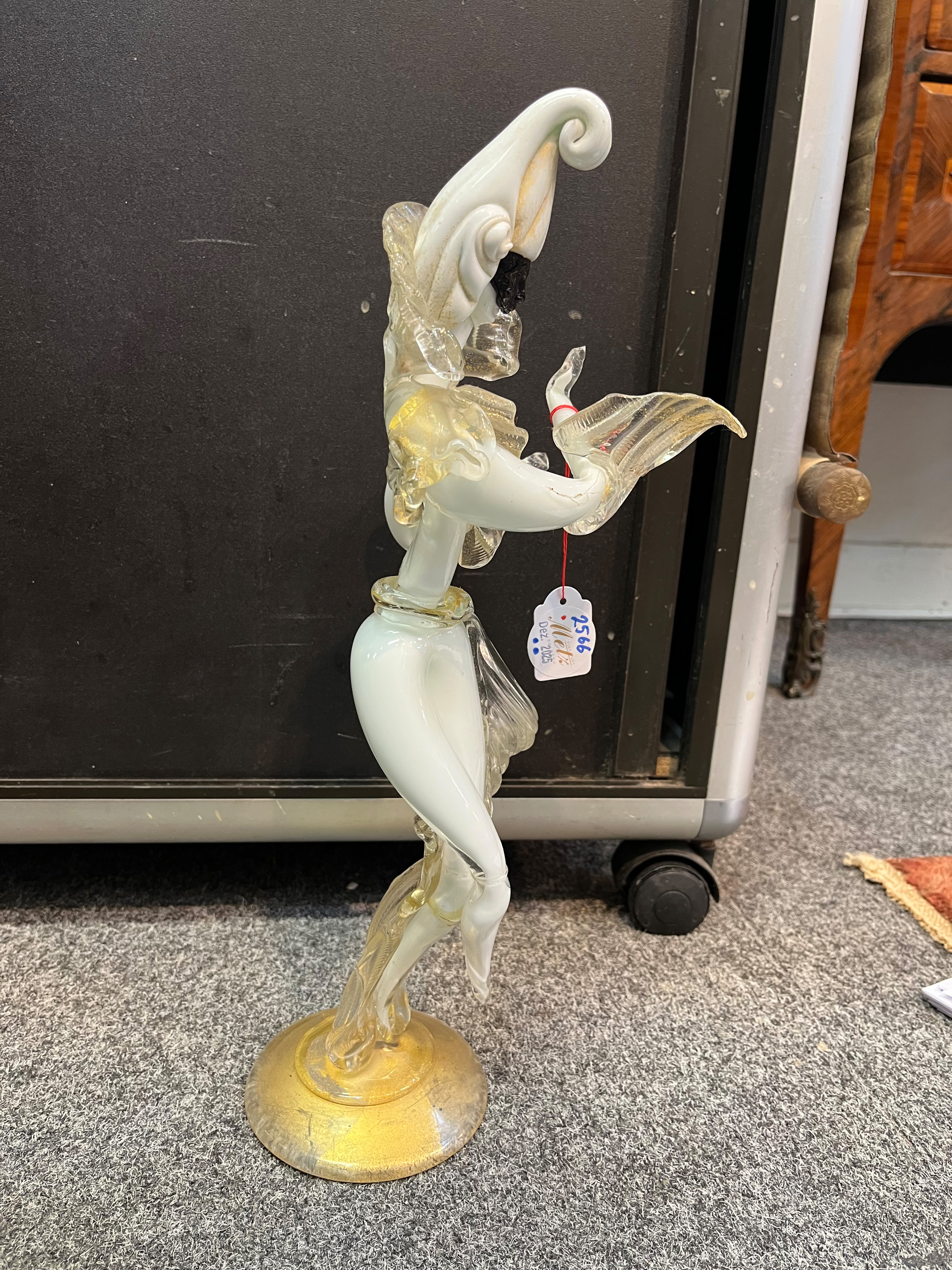 - Katalog-Nr: 2566„Rara Coppia di Ballerini Mascherati“. Murano, Cesare Toso 20. Jh. Milchglas mit Goldpulvereinschmelzung, H=37,5 / 38 cm. (besch.)o.L.