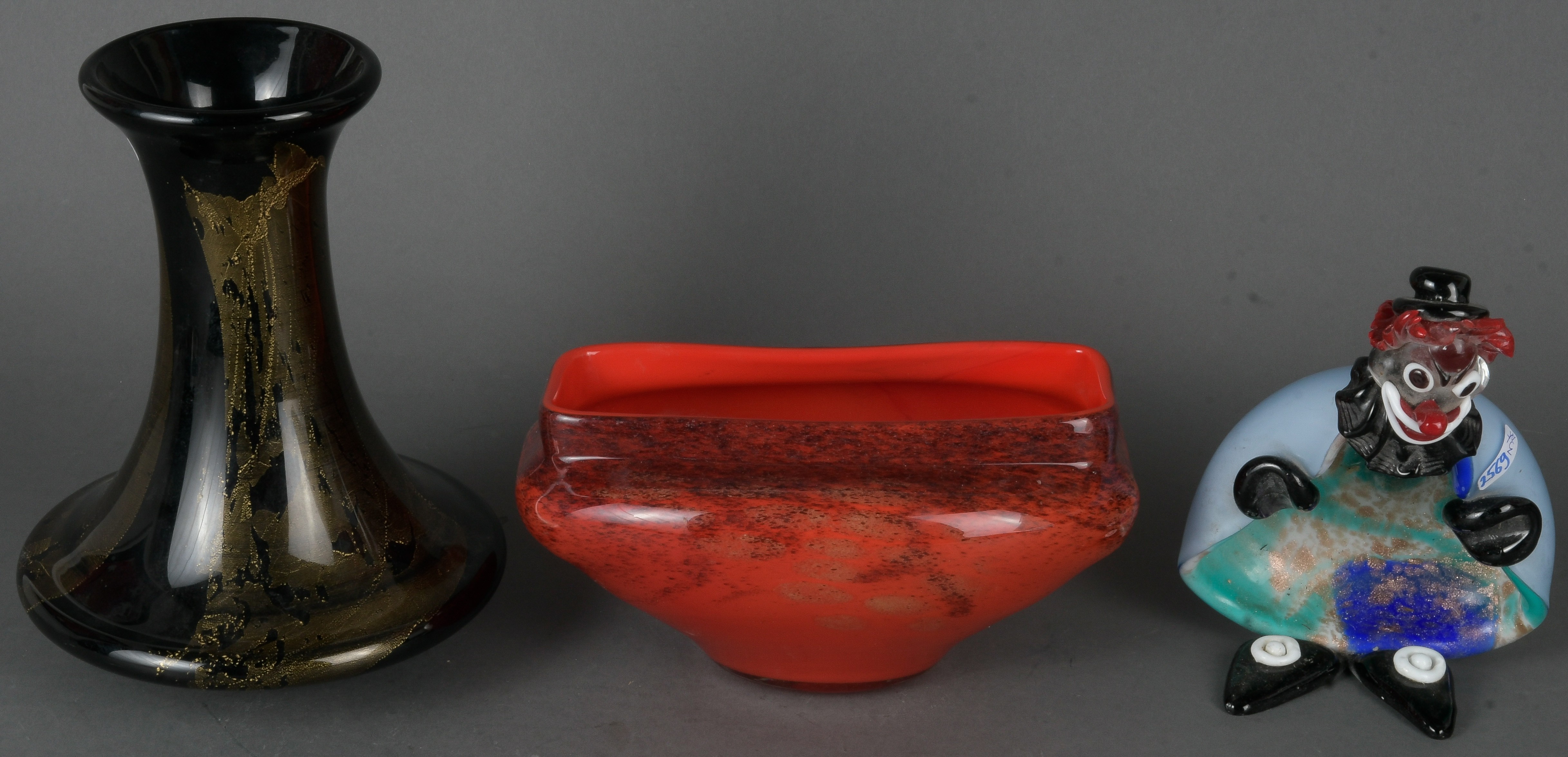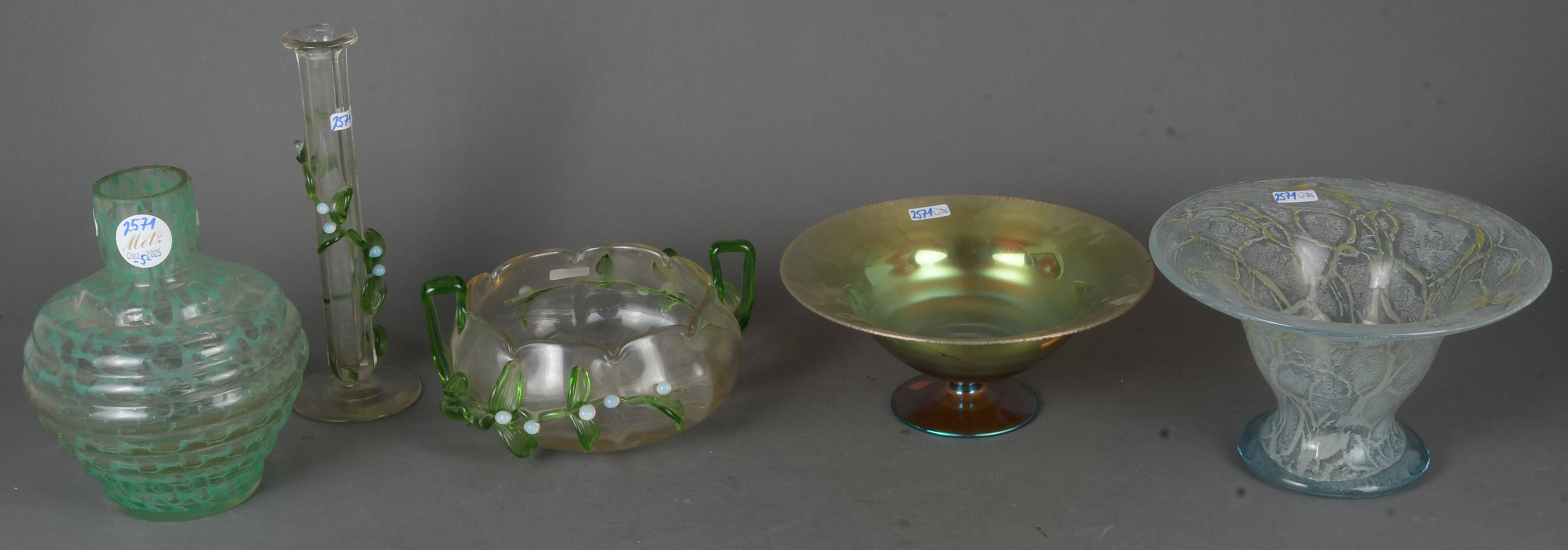 - Katalog-Nr: 2571Fünftlgs. Konvolut Glas. Deutsch, u.a. WMF / Murano 20. Jh. Farbig überfangen, teilw. lüstrierend bzw. mit Aufschmelzungen. Bestehend aus: Drei Schalen und zwei Vasen, H=10 bis 19 cm / D=8 bis 22 cm. (eine besch.)o.L.