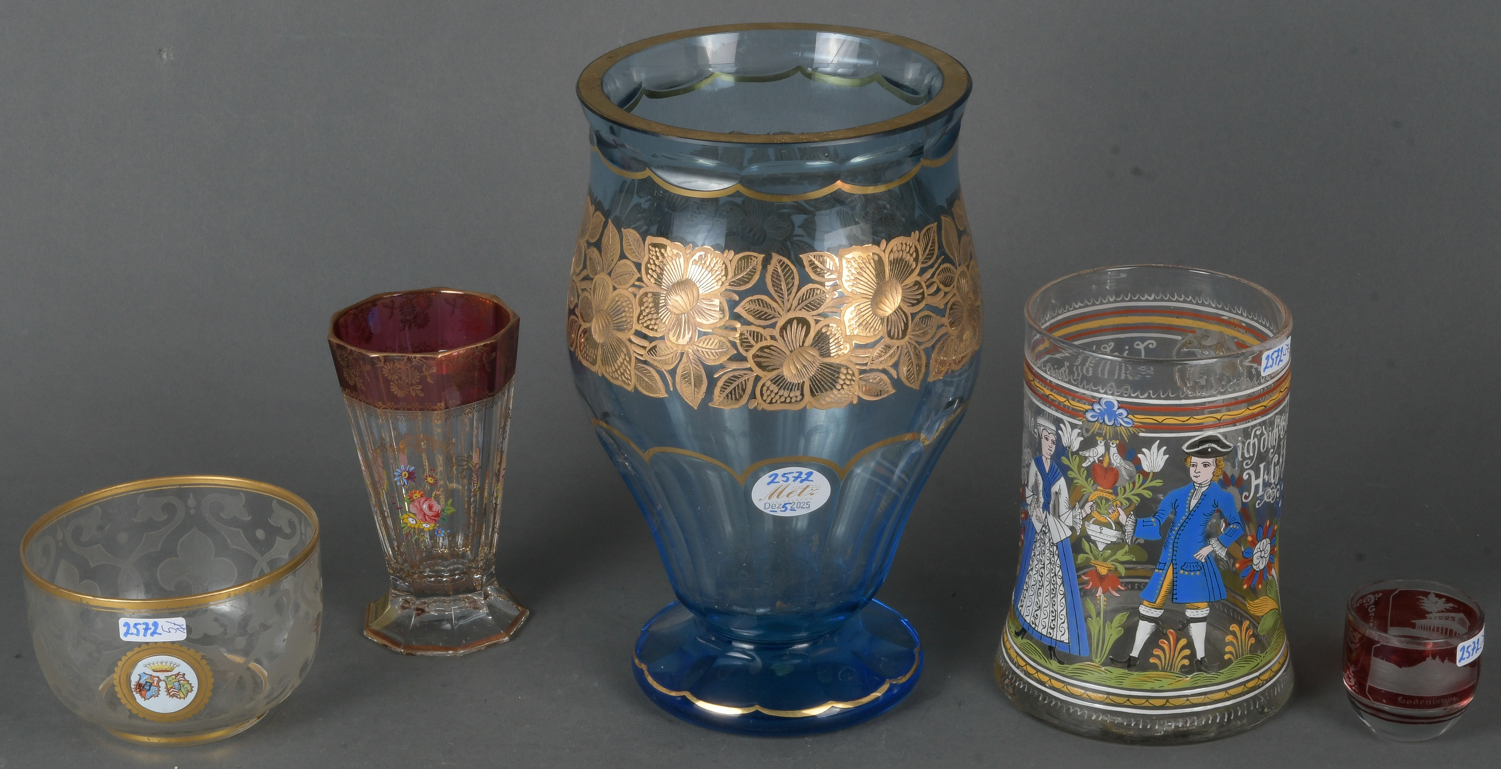 - Katalog-Nr: 2572Fünftlgs. Konvolut Glas. Böhmen, u.a. Karlsbad Moser 20. Jh. Farbig überfangen, teilw. bemalt, geschliffen und gold gehöht. Bestehend aus: Zwei Becher, ein Henkelkrug, eine Schale und eine Vase, H=5,5 bis 25,5 cm / D=5 bis 15 cm.o.L.