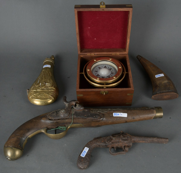 - Katalog-Nr: 2551Fünftlgs. Konvolut des 19./20. Jhs.: Eine Reiter-Perkussionspistole (L=23 / 40 cm), eine Deko-Pistole (L=23 cm), zwei Pulverhörner mit Messinghahn (L=16,5 bis 22 cm) und ein Holzkompass im Etui, Hamburg C. Plath (H=10 cm, B=15,5 cm, T=15 cm).o.L.