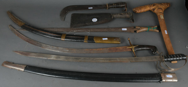 - Katalog-Nr: 2552Südsee-Konvolut Deko-Waffen wie Säbel, teilw. mit Scheide, und Werkzeug, L=37 bis 93 cm.o.L.