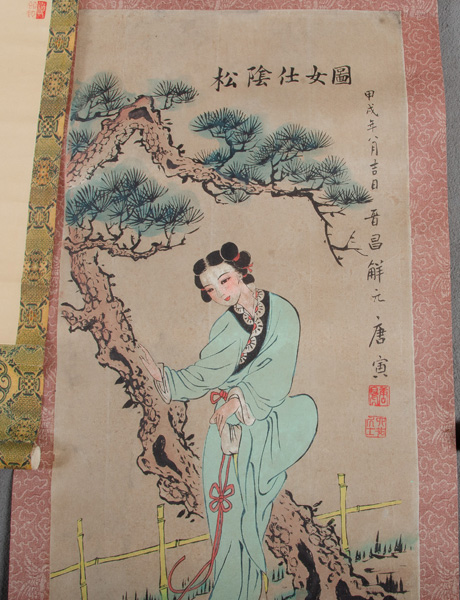 - Katalog-Nr: 2554Sieben Rollbilder. Asien. Papier / Seide, bunt bemalt mit Fischen, Gebäuden, Personen und Schriftzeichen, 45 x 25 bis 122 x 65 cm.o.L.