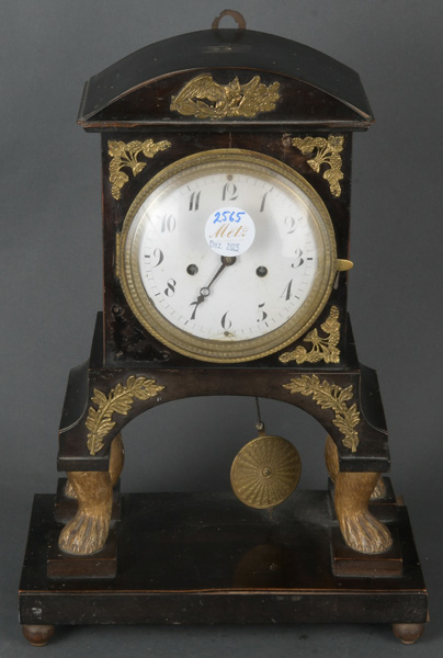 - Katalog-Nr: 2565Tischuhr. Wohl Wien 19. Jh. Massivholz, schwarz lackiert, teilw. auf Kreidegrund vergoldet, mit Messingapplikationen; Kugelfüße mit Löwenpranken, geschweiftes Gehäuse, Uhrwerk mit doppeltem Schlüsselaufzug, H=38 cm, B=26 cm, T=14 cm. (Funktion ungeprüft)o.L.