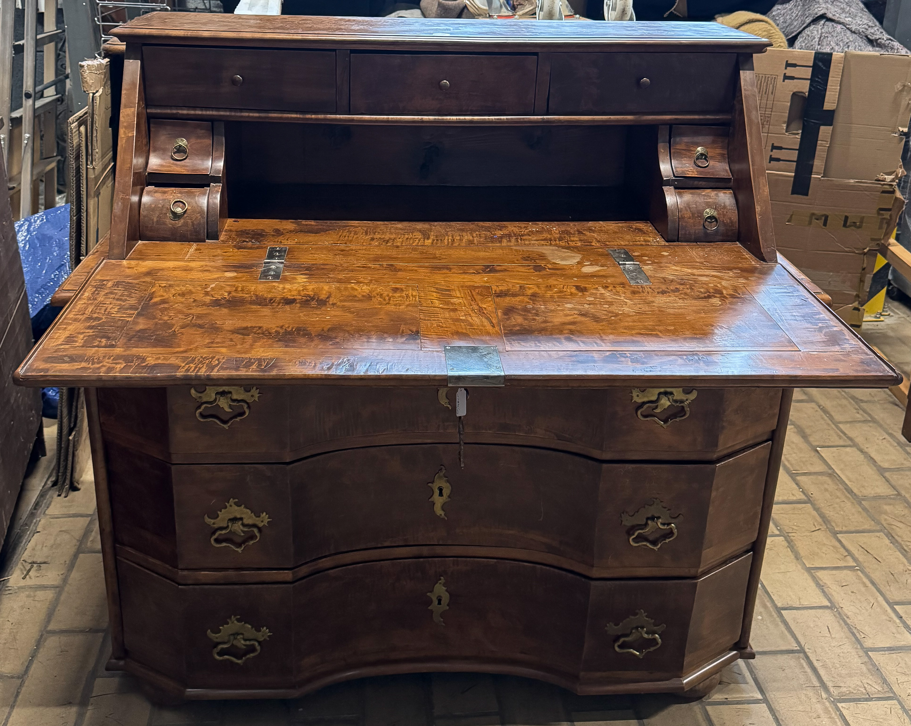 - Katalog-Nr: 2638Schreibkommode. Deutsch 18./19. Jh. Massiv Birnbaum; Kugelfüße, dreischübig, abgeschrägte Kanten, mittig gebogen, gerade Seiten auf Füllung, zurückgesetzte Schreibklappe mit Inneneinteilung, profilierte Deckplatte, H=115 cm, B=122 cm, T=64 cm. >>> Diese Los Nr. kann am MI, 17.12.25 (10.00 h bis 12.00 h) und SA, 20.12.25 (13.00 h bis 14.00 h) in unserem Depot Mannheim abgeholt werden.o.L.
