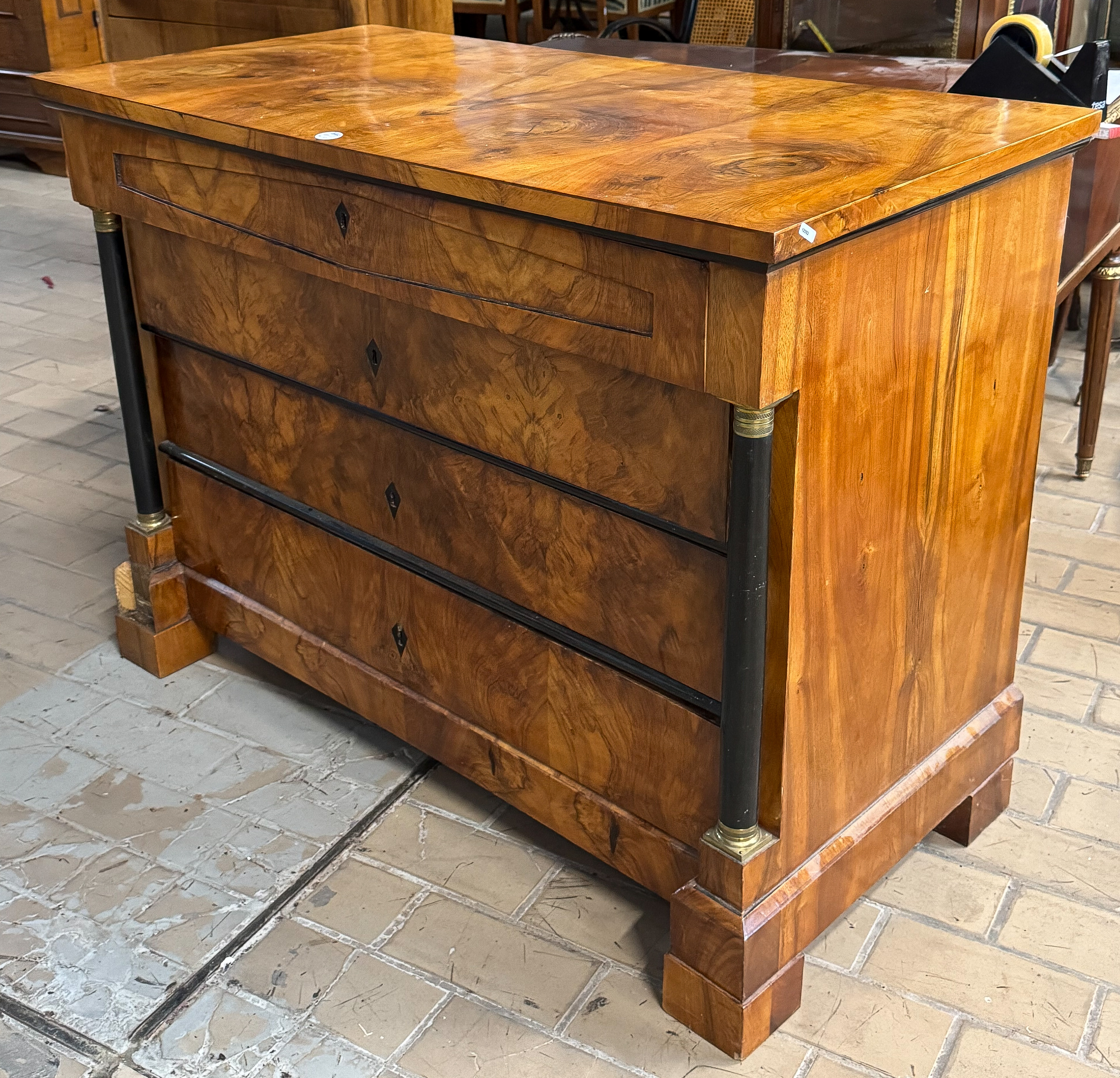 - Katalog-Nr: 2642Biedermeier-Kommode. Deutsch 19. Jh. Nussbaum furniert, teilw. ebonisiert, mit Messingbeschläge; Klotzfüße, gerader Sockel, vierschübig, der obere Schub leicht vorgesetzt, flankierende Säulen, überstehende Platte, H=91 cm, B=121 cm, T=62 cm. >>> Diese Los Nr. kann am MI, 17.12.25 (10.00 h bis 12.00 h) und SA, 20.12.25 (13.00 h bis 14.00 h) in unserem Depot Mannheim abgeholt werden.o.L.