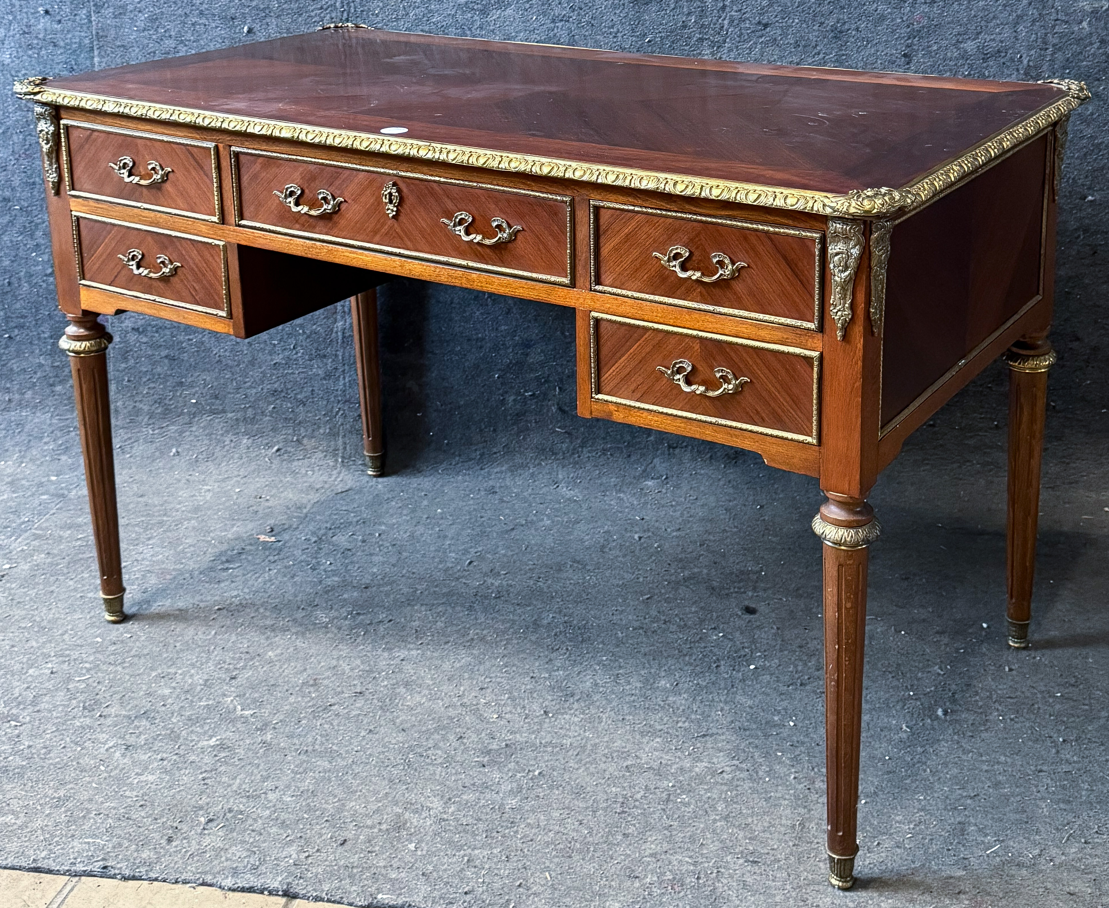 - Katalog-Nr: 2643Bureauplat im Louis XVI-Stil. Frankreich 20. Jh. Mahagoni furniert, teilw. massiv, mit Bronzeapplikationen; gedrechselte Beine, fünfschübig, mittig Ausschnitt, seitl. und verso in Füllung gearbeitet, überstehende Platte, H=78 cm, B=122 cm, T=67 cm.>>> Diese Los Nr. kann am MI, 17.12.25 (10.00 h bis 12.00 h) und SA, 20.12.25 (13.00 h bis 14.00 h) in unserem Depot Mannheim abgeholt werden.o.L.