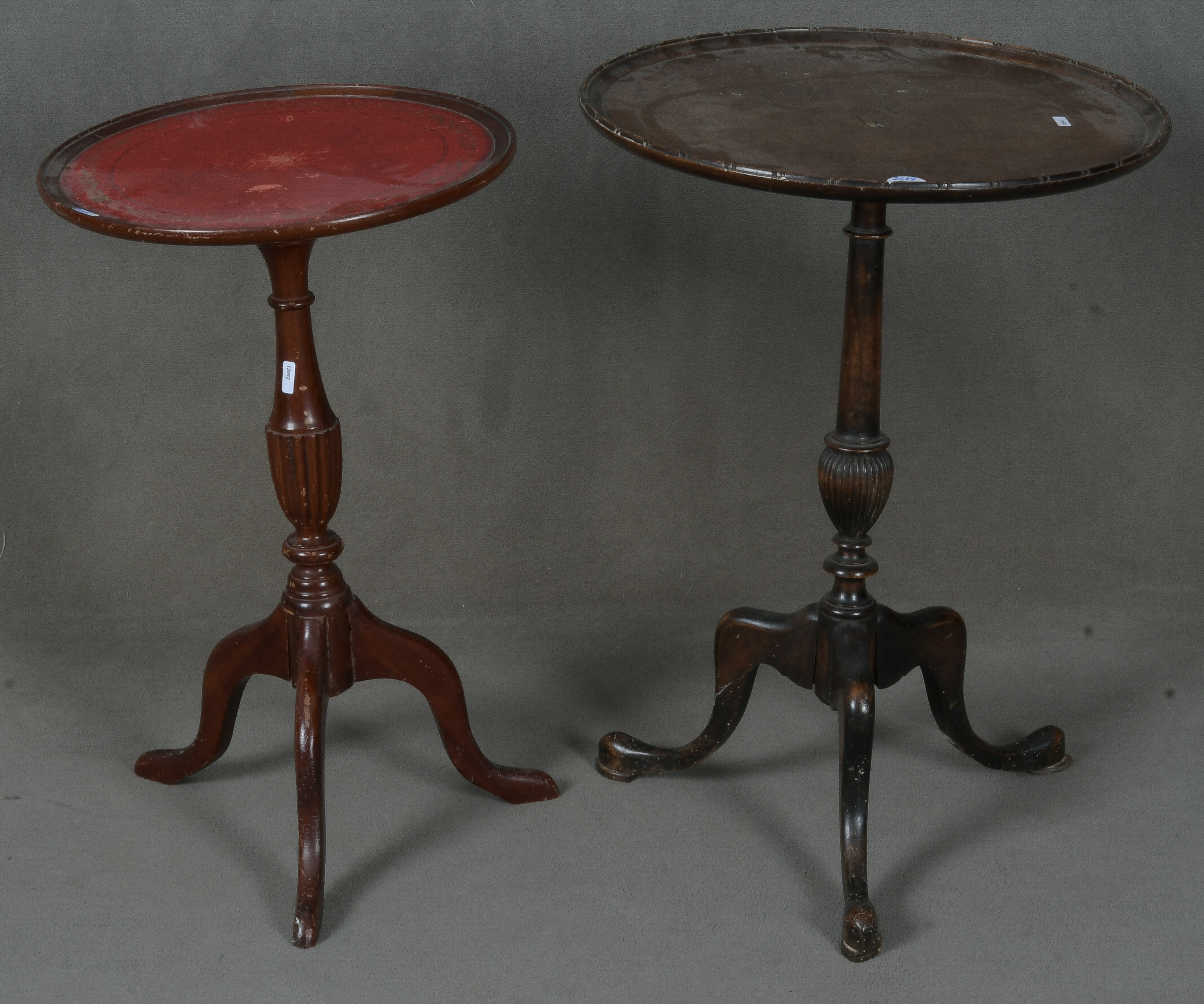 - Katalog-Nr: 2649Zwei runde Beistelltische. England 20. Jh. Massiv Mahagoni, teilw. gedrechselt und geschnitzt; dreipassiger Fuß, Mittelsäule, überstehende Platte, (einer) mit roter Ledereinlage, H=59 cm, D=37 cm / H=63 cm, D=45 cm.o.L.