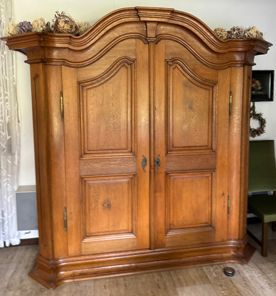 - Katalog-Nr: 2639Barock-Schrank. Pfalz 18. Jh. Massiv Eiche; profilierter Sockel, zweitürig mit abgeschrägten Ecken, Türen und Seiten in Füllung gearbeitet, überstehendes, geschweiftes, profiliertes Gesims (H=230 cm). Provenienz: Heinrich Winnikes, Heidelberg 28. Juni 1976, für DM 15.000,00. >>> Diese Los Nr. kann am MI, 17.12.25 (10.00 h bis 12.00 h) und SA, 20.12.25 (13.00 h bis 14.00 h) in unserem Depot Mannheim abgeholt werden.o.L.
