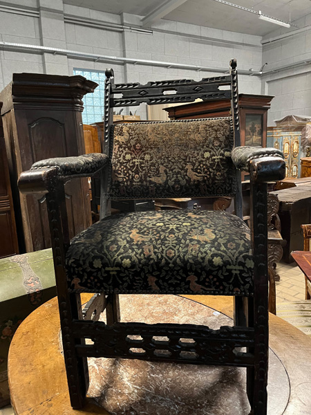 - Katalog-Nr: 2640Armlehnsessel. Wohl Worpswede um 1800. Massiv Nussbaum, teilw. geschnitzt, mit Gobelinbezug.o.L.