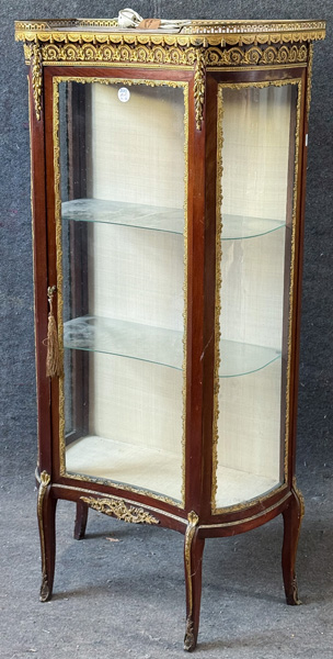 - Katalog-Nr: 2644Vitrine im Louis XVI-Stil. Frankreich 20. Jh. Mahgoni furniert, mit Bronzezierbeschlägen; geschweifte Füße, eintürig, halbrund und dreiseitig verglast, leicht überstehende Platte mit durchbrochener Galerie, H=147 cm, B=66 cm, T=35 cm. >>> Diese Los Nr. kann am MI, 17.12.25 (10.00 h bis 12.00 h) und SA, 20.12.25 (13.00 h bis 14.00 h) in unserem Depot Mannheim abgeholt werden.o.L.