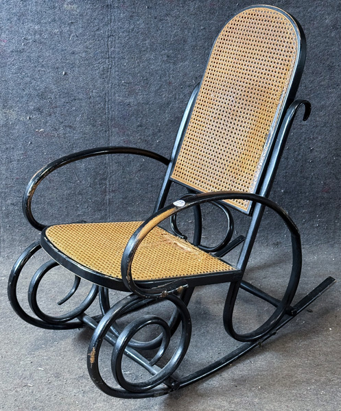 - Katalog-Nr: 2646Schaukelstuhl. Wien, Thonet um 1900. Bugholz, schwarz lackiert, mit Flechtwerksitz und -rücken. (besch.) >>> Diese Los Nr. kann am MI, 17.12.25 (10.00 h bis 12.00 h) und SA, 20.12.25 (13.00 h bis 14.00 h) in unserem Depot Mannheim abgeholt werden.o.L.