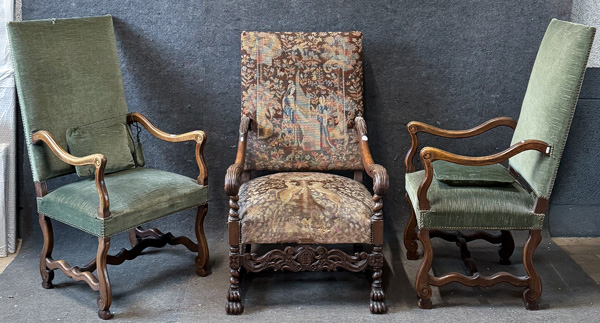 - Katalog-Nr: 2647Drei Historismus-Armlehnsessel. Deutsch um 1900. Massiv Nussbaum bzw. Eiche, geschweift, geschnitzt und gedrechselt, mit gepolstertem Sitz und Rücken; einer mit Gobelinbezug. >>> Diese Los Nr. kann am MI, 17.12.25 (10.00 h bis 12.00 h) und SA, 20.12.25 (13.00 h bis 14.00 h) in unserem Depot Mannheim abgeholt werden.o.L.