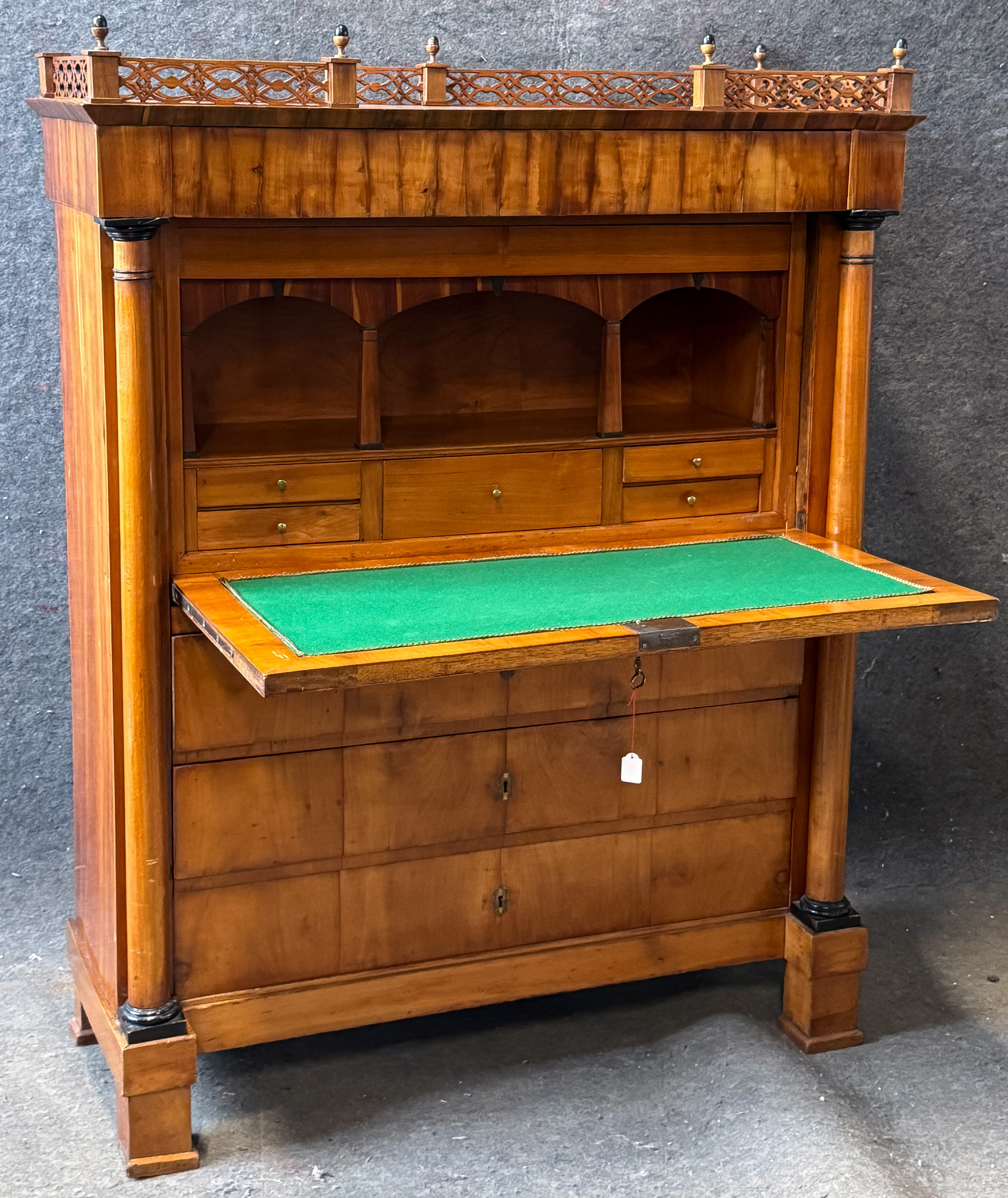 - Katalog-Nr: 2651Biedermeier-Standsekretär. Süddeutsch 19. Jh. Kirschbaum furniert, teilw. massiv und ebonisiert; Klotzfüße, gerader Sockel, vierschügig mit vorgesetzten Säulen, Schreibklappe mit aufwendiger Inneneinteilung, profilierte Platte mit durchbrochener Galerie, H=154 cm, B=121 cm, T=45 cm.o.L.
