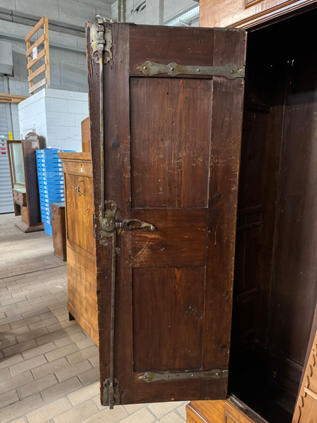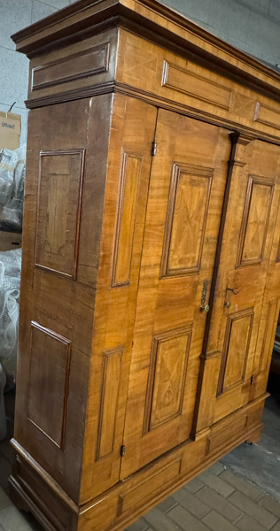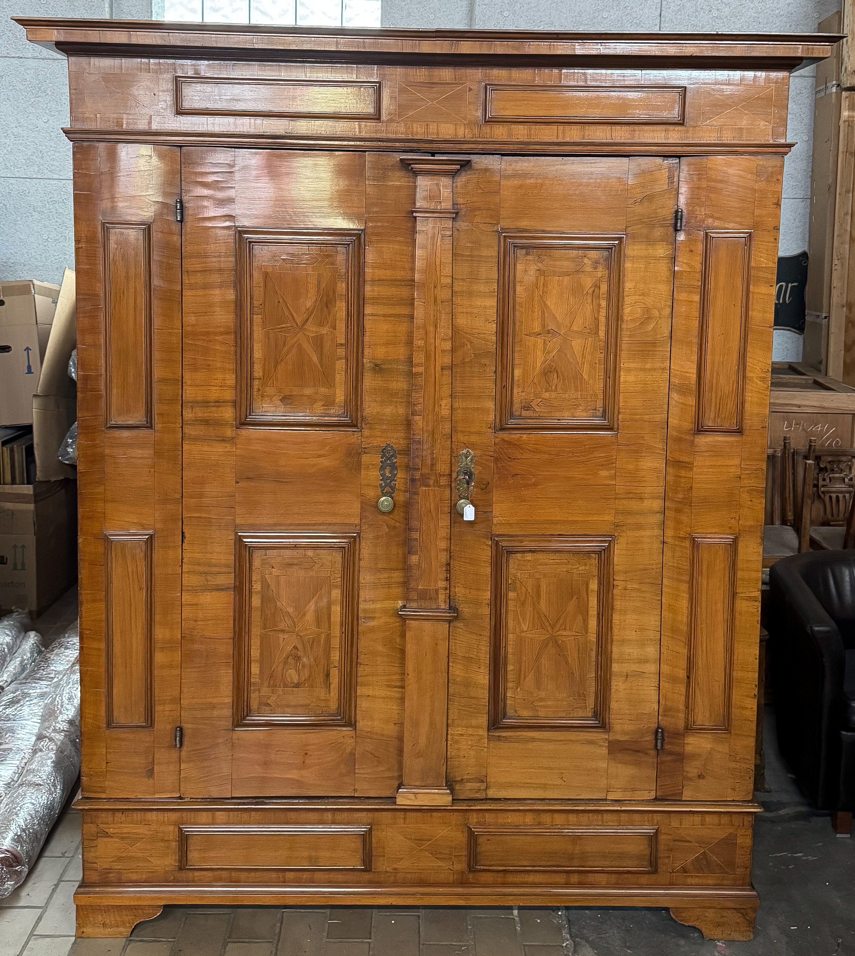 - Katalog-Nr: 2652Barock-Schrank. Süddeutsch 18. Jh. Nussbaum furniert, teilw. massiv und intarsiert mit Sterndekor, aufwendiges Schloss mit Verriegelung, Messingbeschläge; ausgesägte Füße, profilierter Sockel, zweitürig mit aufgesetzten Füllungen, vorgeblendete Schlagleiste, profiliertes Gesims, H=228 cm, B=192 cm, T=65 cm.o.L.