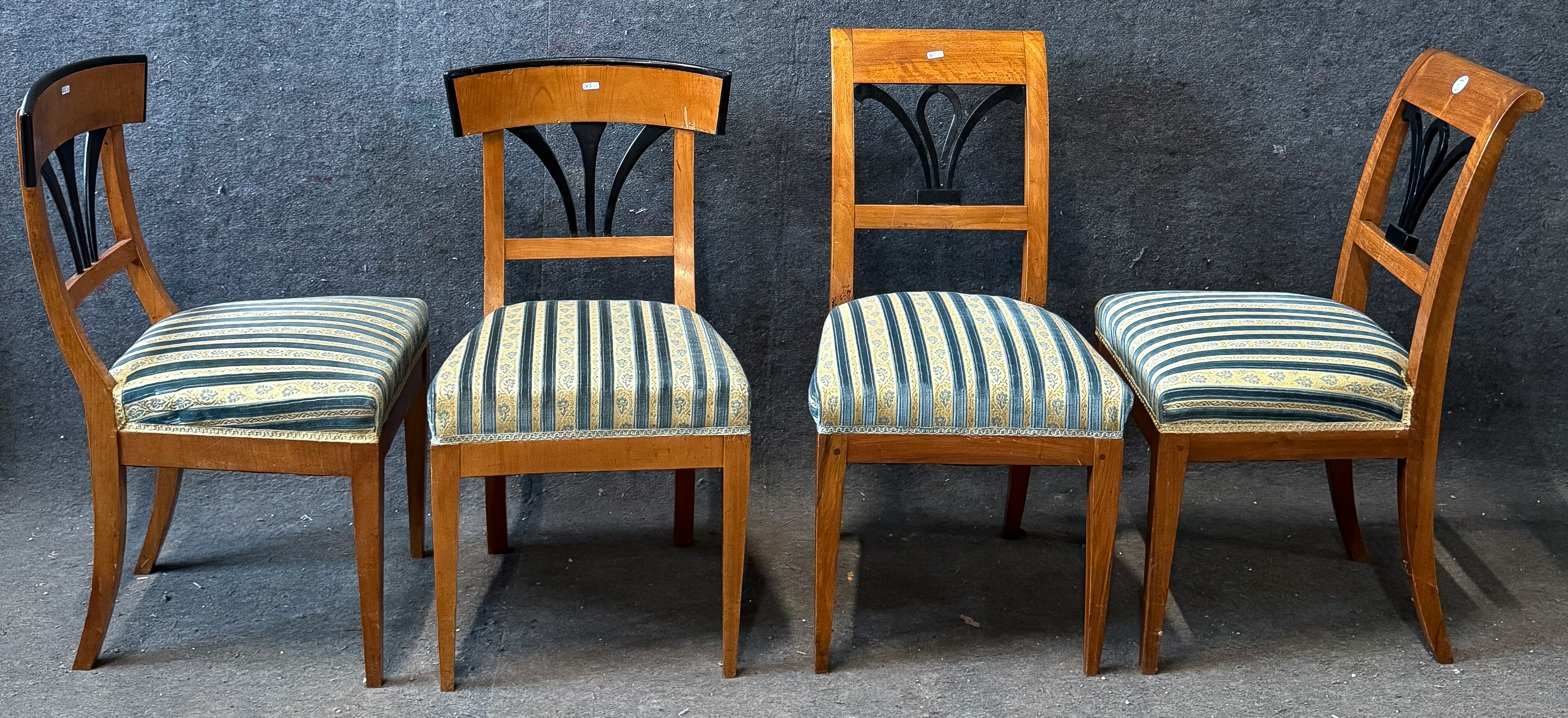 - Katalog-Nr: 2655Vier Biedermeier-Stühle. Süddeutsch 19. Jh. Massiv Nuss- und Kirschbaum, teilw. furniert und ebonisiert; sich nach unten verjüngende Vierkant- und Säbelbeine, durchbrochene Rückenlehne mit Fächerdekor, gepolsterte Sitzfläche. >>> Diese Los Nr. kann am MI, 17.12.25 (10.00 h bis 12.00 h) und SA, 20.12.25 (13.00 h bis 14.00 h) in unserem Depot Mannheim abgeholt werden.o.L.