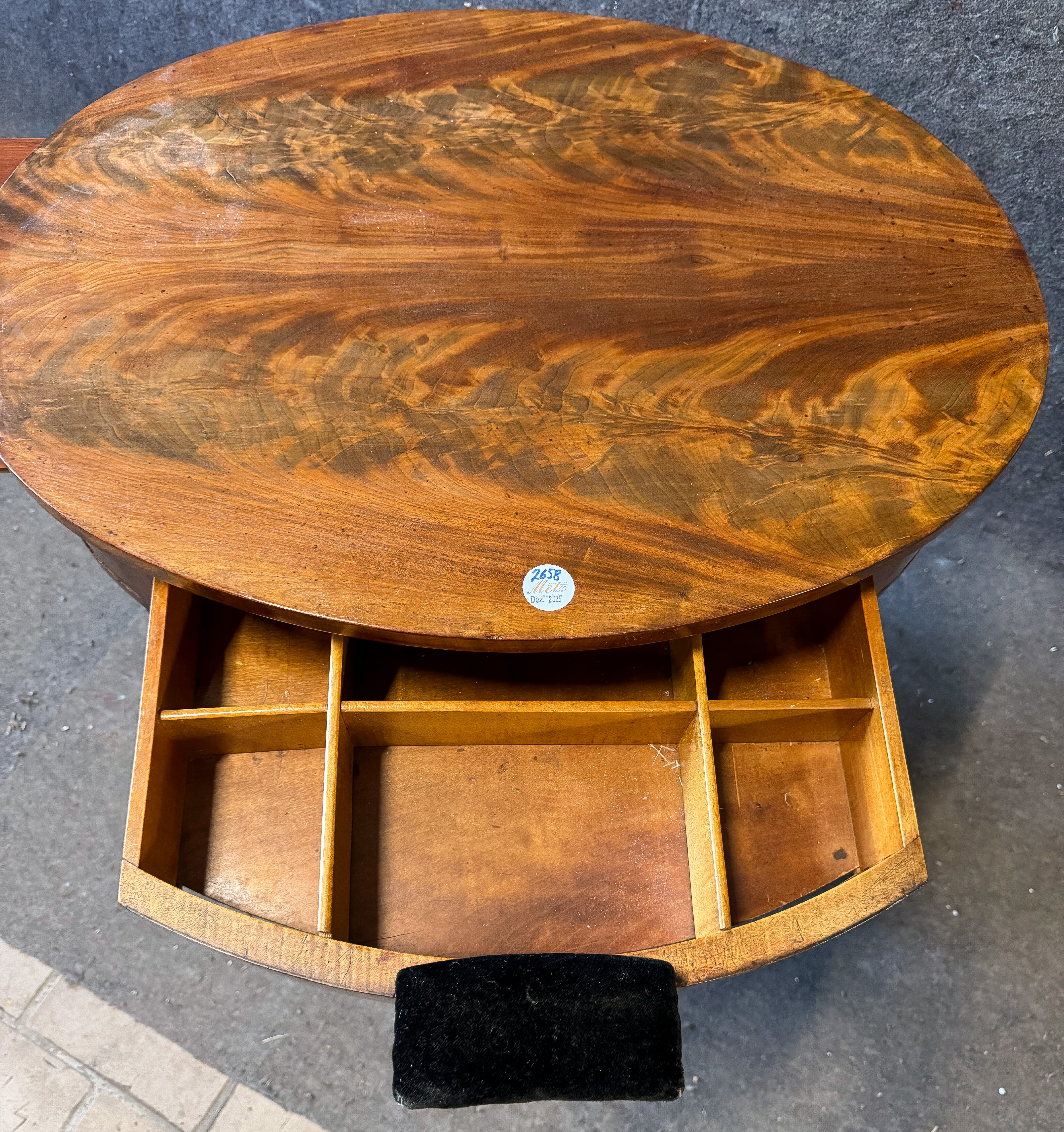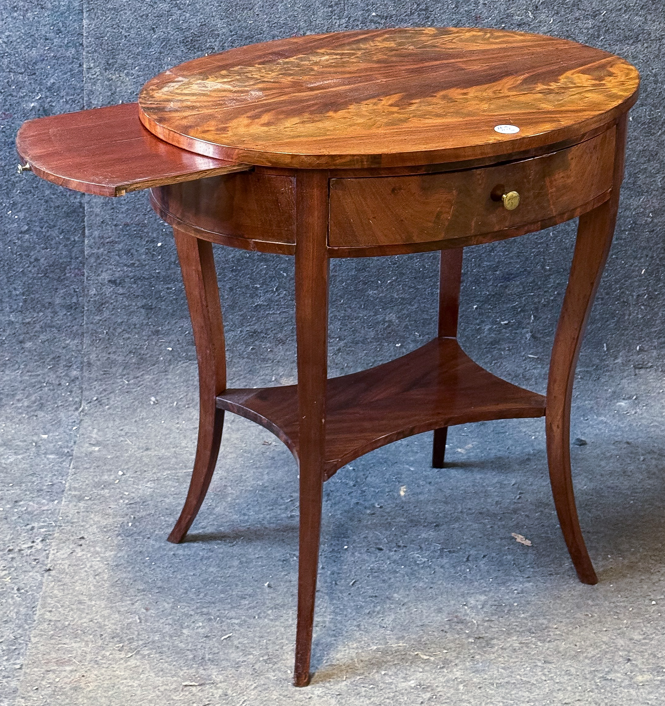 - Katalog-Nr: 2658Ovaler Biedermeier-Nähtisch. Norddeutsch 19. Jh. Mahagoni furniert, teilw. massiv; Säbelbeine mit Mittelbrett, einschübiger Tischkasten, seitl. zwei kleine herausziehbare Ablagen, überstehende Platte, H=75,5 cm, B=71 cm, T=54,5 cm.o.L.