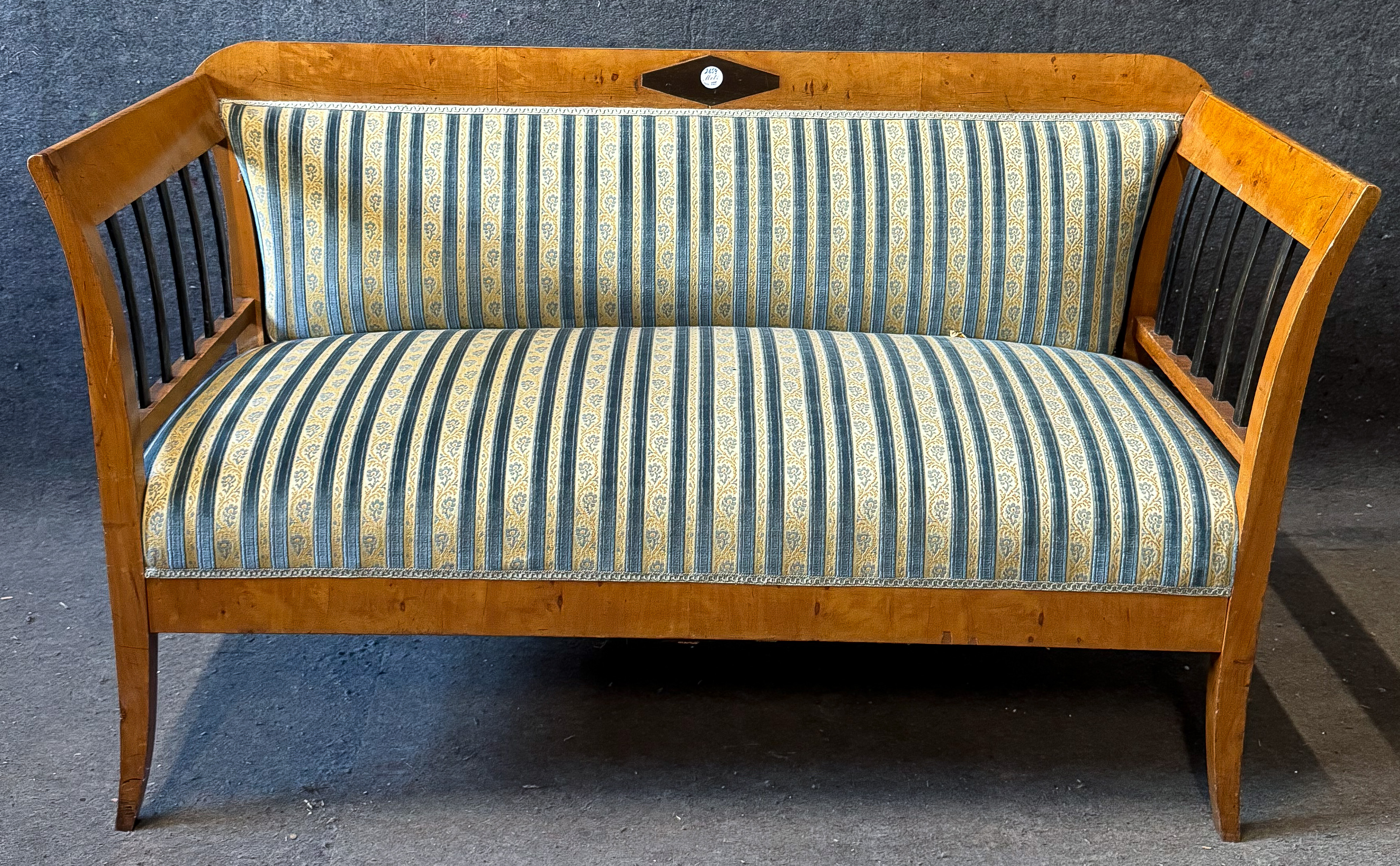 - Katalog-Nr: 2659Biedermeier-Sofa. Süddeutsch 19. Jh. Massiv Birke, teilw. massiv und ebonisiert; Säbelbeinde, seitl. Stäbe, gerader Rücken, gepolsterte Sitzfläche, Arm- und Rückenlehne, B=142 cm.>>> Diese Los Nr. kann am MI, 17.12.25 (10.00 h bis 12.00 h) und SA, 20.12.25 (13.00 h bis 14.00 h) in unserem Depot Mannheim abgeholt werden.o.L.