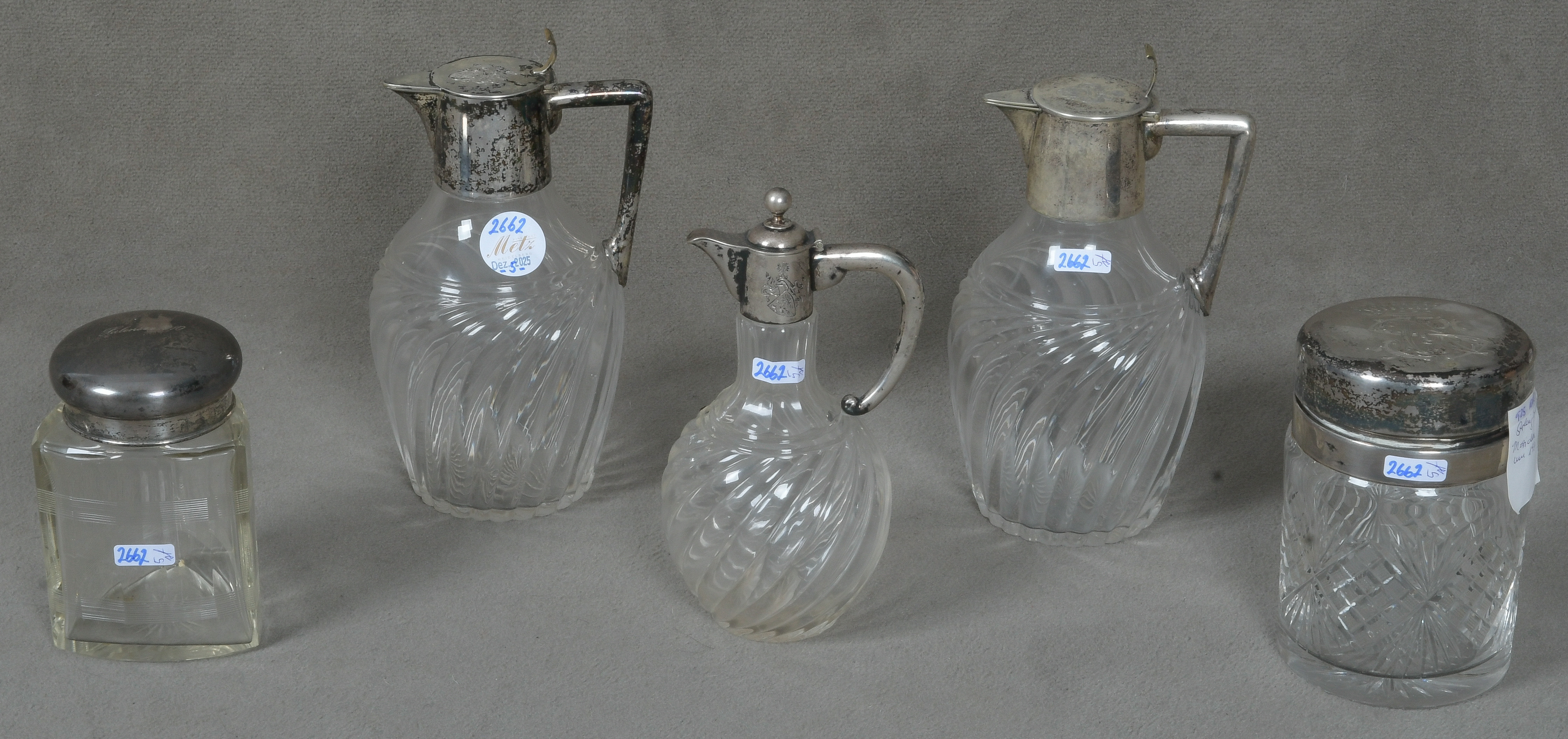 - Katalog-Nr: 2662Konvolut Glas mit Silbermontur, u.a. Deckelgefäße und Schenkkannen, H=13,5 bis 23 cm.o.L.