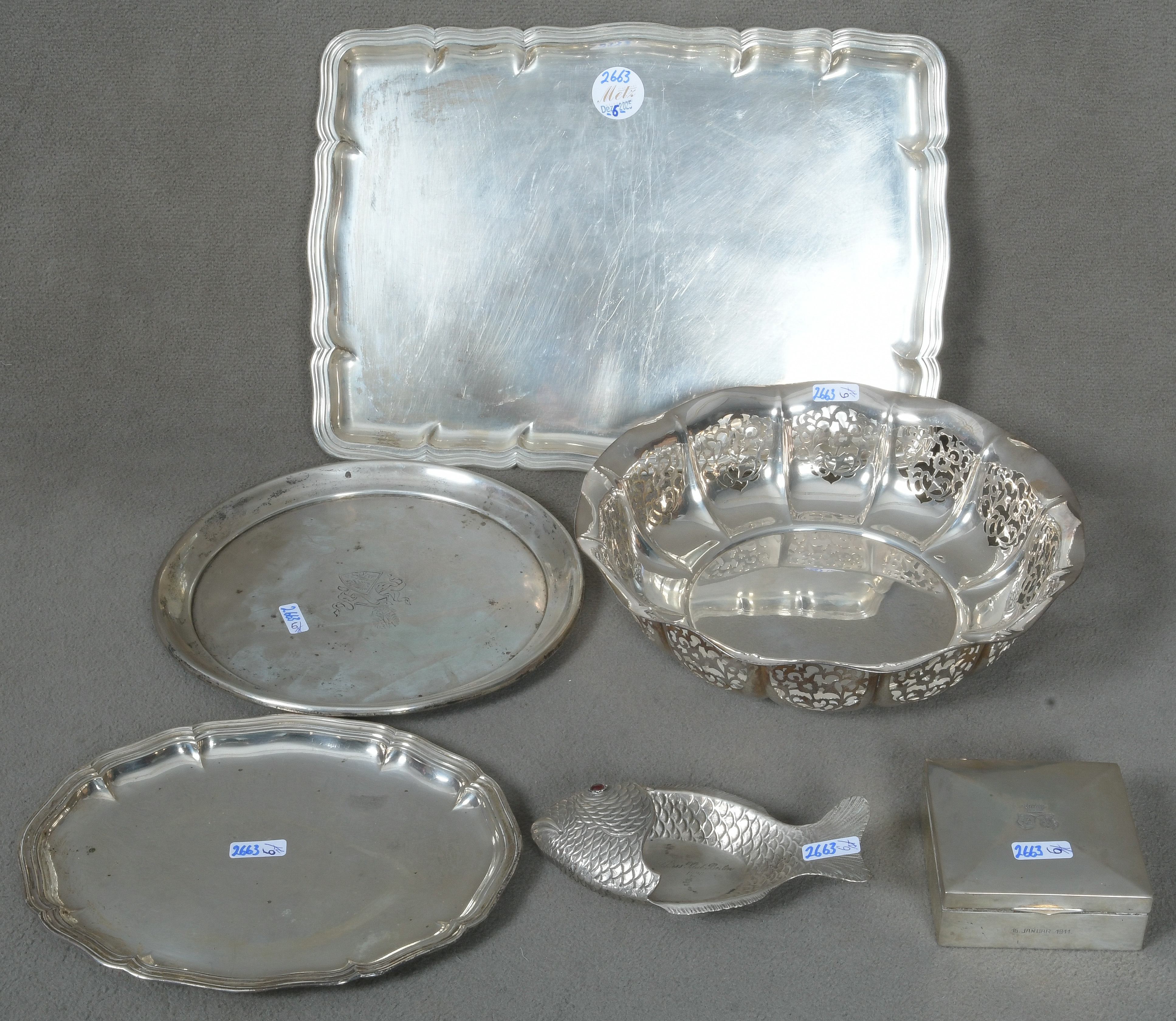 - Katalog-Nr: 2663Konvolut Silber, ca. 1.000 g, u.a. Deckeldosen, Schalen und Tabletts, H=1,5 bis 6,5 cm, D=22,5 bis 26 cm.o.L.
