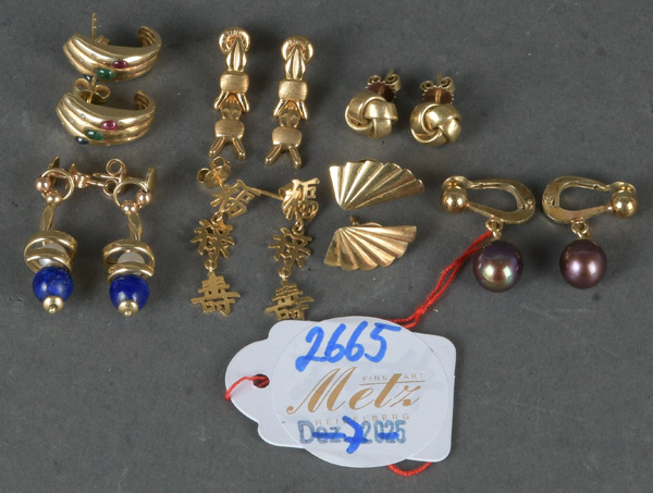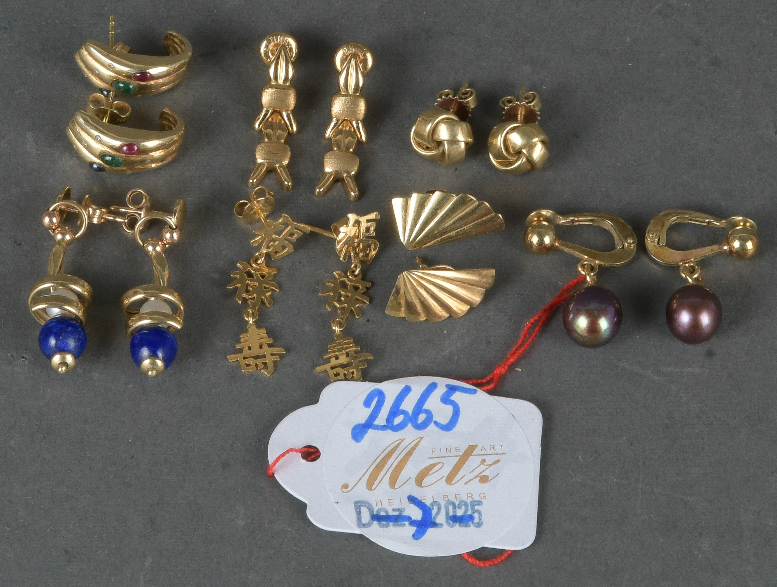 - Katalog-Nr: 2665Sieben Paar Ohrstecker. 14 kt Gold, besetzt mit Perlen und lapislazuli-, rubin-, saphir- und smaragdfarbigen Steinen, Gesamtgewicht ca. 24,75 g.o.L.
