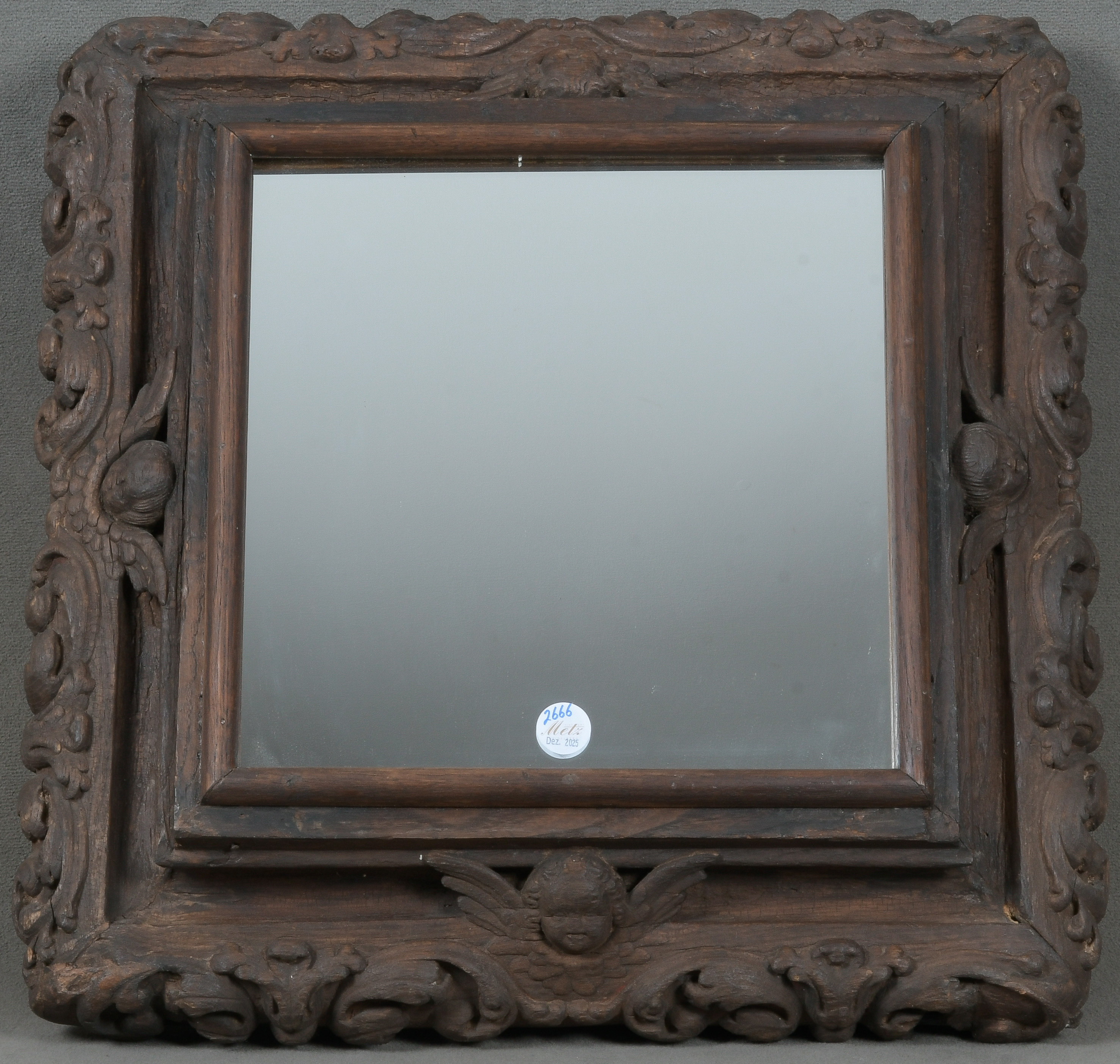 - Katalog-Nr: 2666Barock-Rahmen. Spanien 17. Jh. Massiv Eiche, geschnitzt mit Blättern, Cherubinen und Rocaillen; mit Hohlkehlprofilen, 63 x 62 cm. (mit Ergänzungen)o.L.