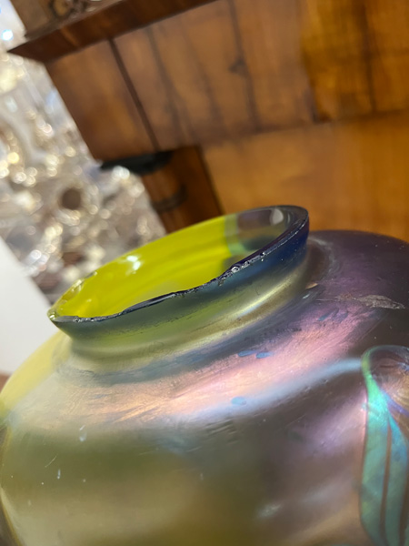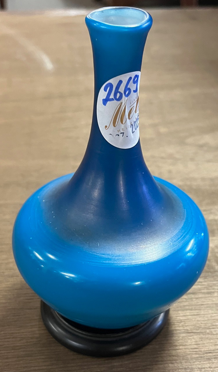 - Katalog-Nr: 2669Vase. USA, Louis Comfort Tiffany 20. Jh. Farbloses Glas, blau verlaufend überfangen; am Boden Ätzsignatur, H=14 cm.o.L.