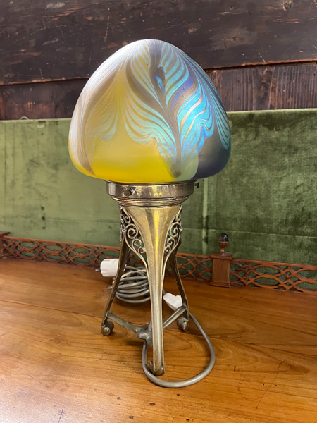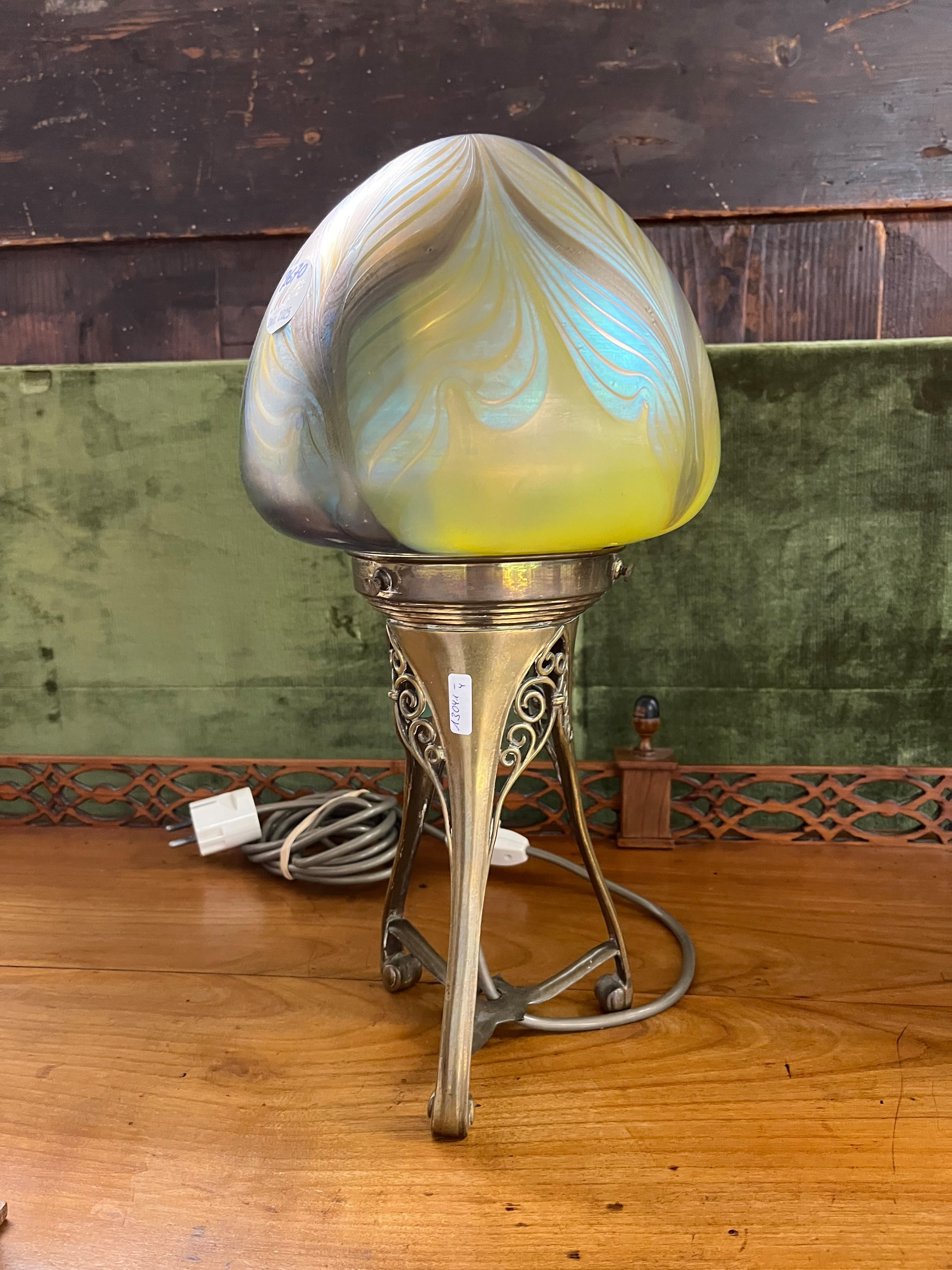- Katalog-Nr: 2670Jugendstil-Lampe. Austria, WW Loetz um 1900. Dreipassiger, hoher Messingfuß mit pilzförmigem Glasschirm, farbig überfangen mit lüstrierend gekämmtem Dekor, H=41 cm, D=20 cm. (Rand min. best. / Funktion ungeprüft)o.L.