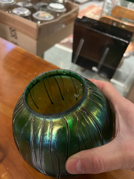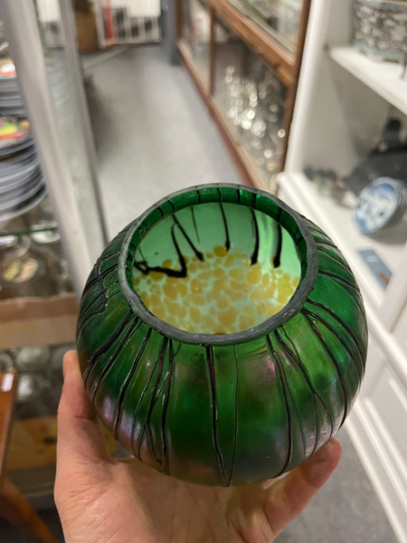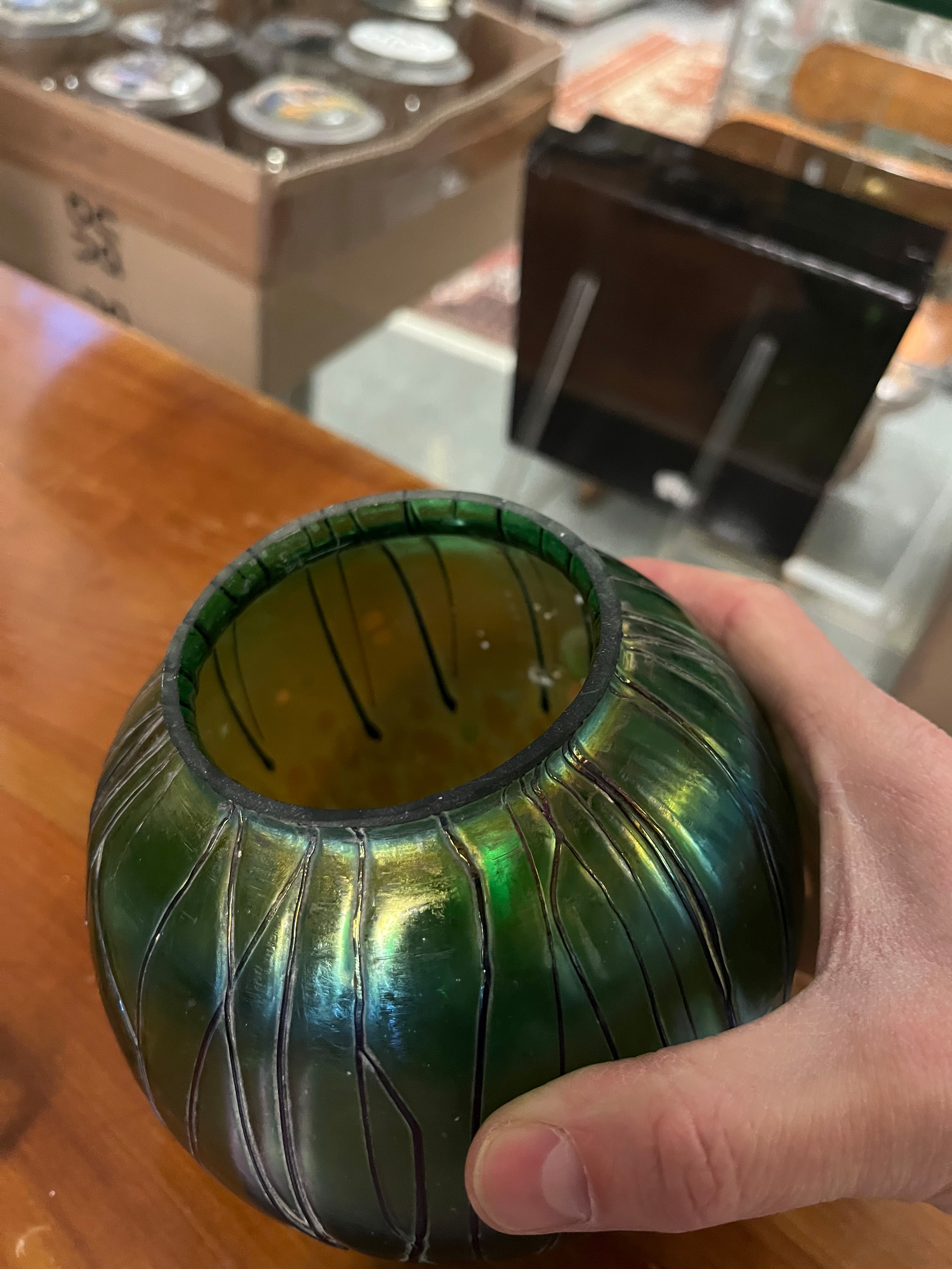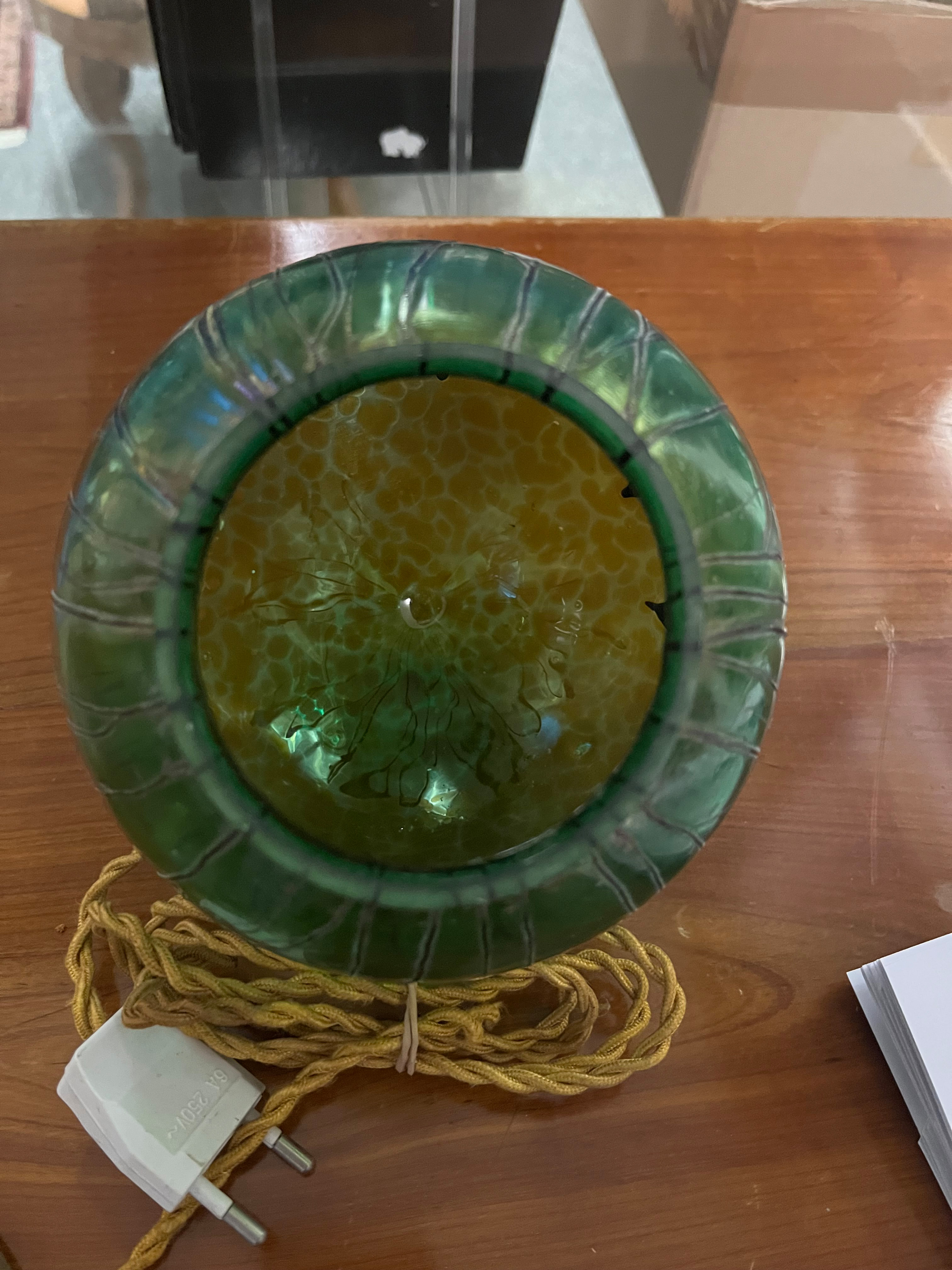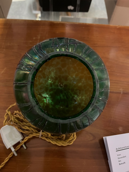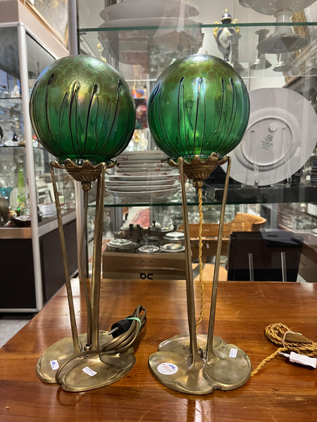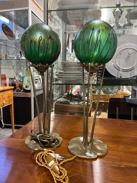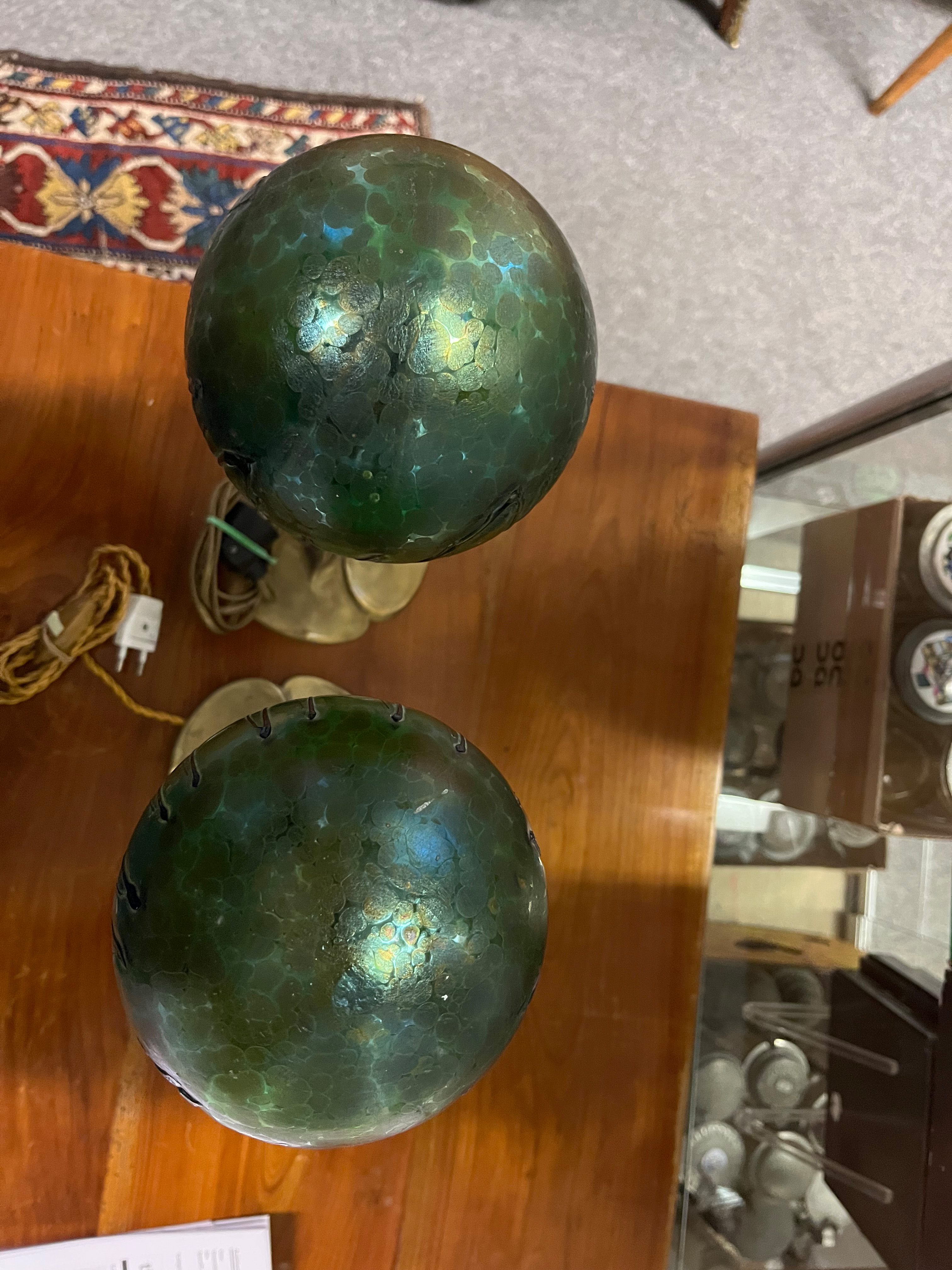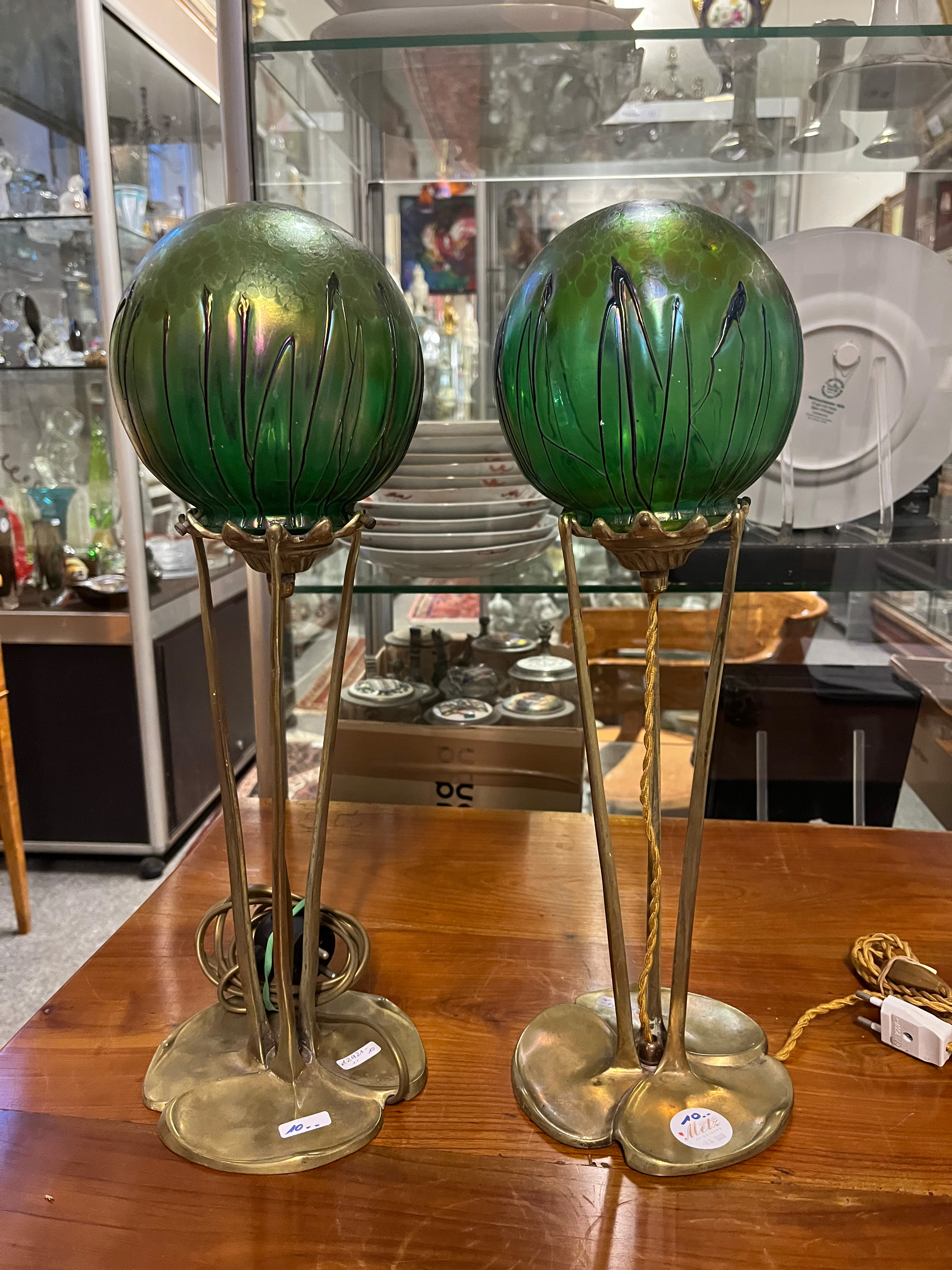 - Katalog-Nr: 10Paar Jugendstil-Lampen. Österreich, Loetz Witwe um 1900. Bronzefuß und -schaft mit kugelförmigem Schirm aus farblosem Glas, grün lüstrierend überfangen, H=je 46 cm. (Funktion ungeprüft)o.L.