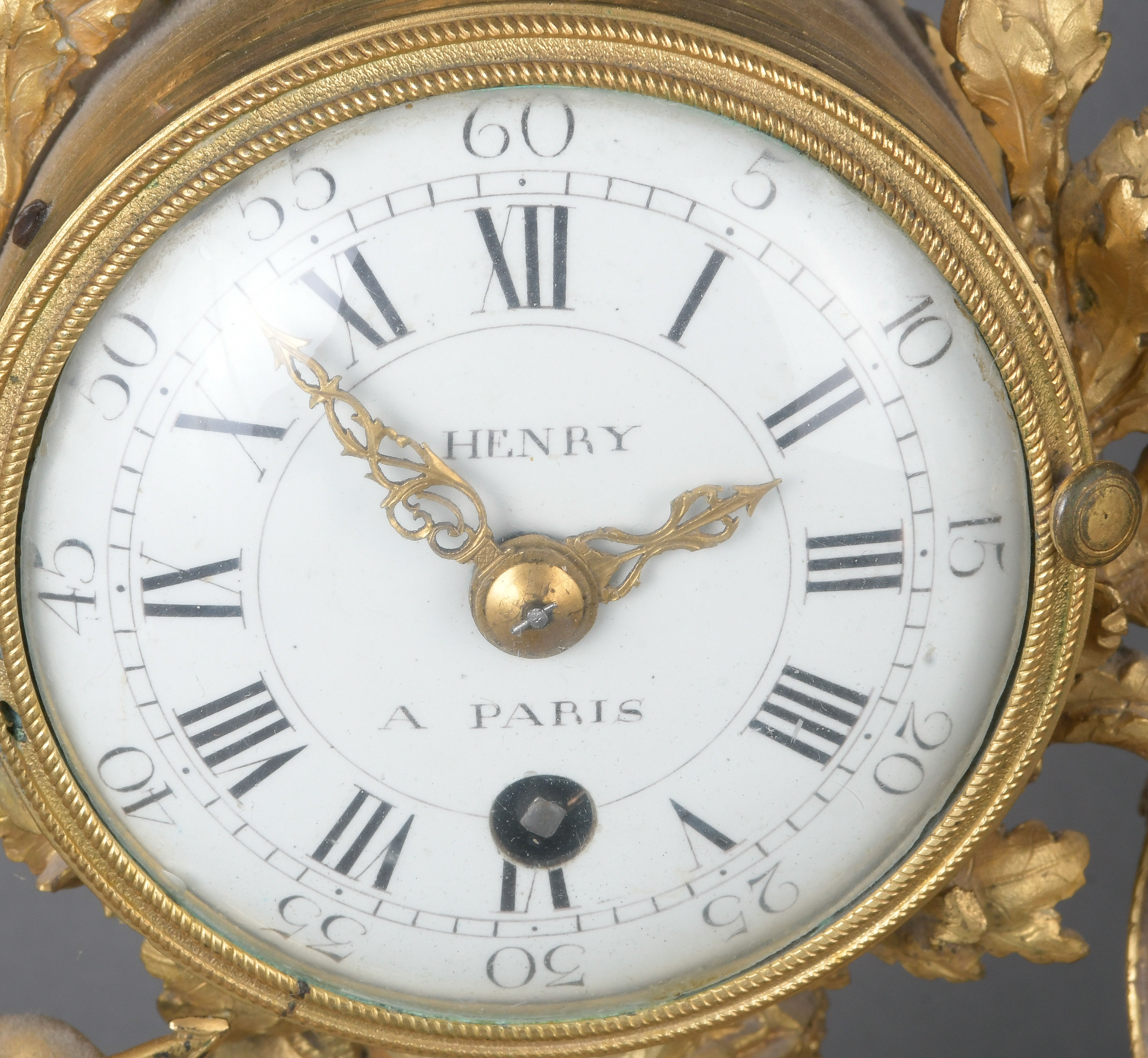 - Katalog-Nr: 280Dreitlge. Kaminuhrengarnitur. Paris, (Marc) Henry 19. Jh. Bronze, feuervergoldet, auf Marmorsockel. Bestehend aus: Kaminuhr (H=31,5 cm, B=20,5 cm, T=9,5 cm) und ein Paar Leuchter (H=je 13 cm). (Funktion ungeprüft)o.L.