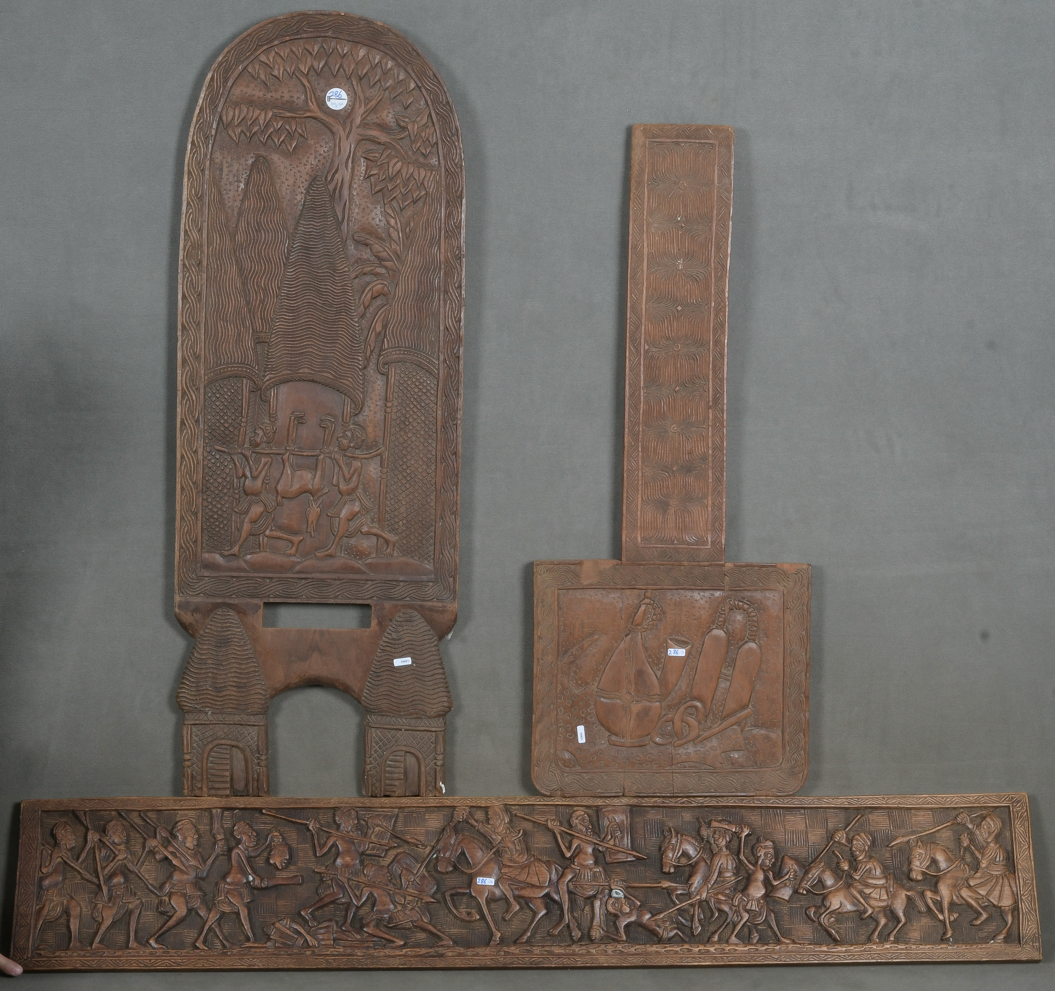 - Katalog-Nr: 286Drei Reliefs. Afrika. Massivholz, geschnitzt mit Reitern, Jägerszene und Transportbehältern, 25 x 41 bis 116 x 151 cm.o.L.